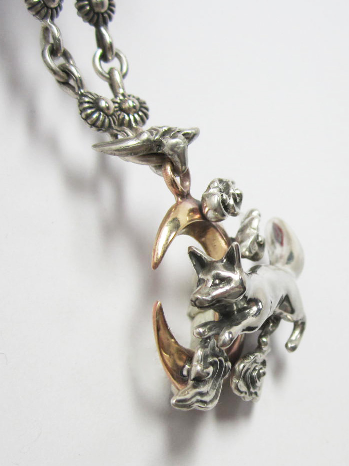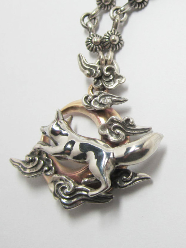 狐霊には修行を積むことで位が上がっていく昇格があります。阿紫霊狐・・・1~100歳までの普通の狐地狐・・・100~500歳余りの狐。仙狐・・・500~900歳。一般に稲荷で祀られている神使のこと。神使とは文字のとおり神様の使いのこと。ここまでの位では霊力が上がるに連れて1~9本と尻尾の数が増えていく。天狐・・・1000歳を超え強力な神通力を持ち神格化した善狐。御先稲荷のトップ。千里眼を持ちさまざまな出来事を見透かす力がある。太い尾が4つ。視覚でとらえられる姿形は無く、霊的な存在とされる。空狐・・・3000歳を超え神通力を自在に操れる大神狐。天狐からさらに2000年生き、御先稲荷を引退した善狐が成るとされている。神通力を自在に操れる大神狐。尾は無い。視覚でとらえられる姿形は無く、霊的な存在とされる。この作品の狐は普通の狐で、立派な霊狐となれるよう月に願いを込めて駆け出している様子を表しています。月に浮かぶ雲は6つありますが、こちらは六輝にちなんだ数になっています。六輝(ろっき)とは、暦に記載される日時・方位などの吉凶、その日の運勢などの一つで、 先勝・友引・先負・仏滅・大安・赤口の6種をいいます。日本では、暦の中でも有名な暦注の一つです。「結婚式は大安がよい」「葬式は友引を避ける」など、主に冠婚葬祭などの儀式と結びついて使用されています。