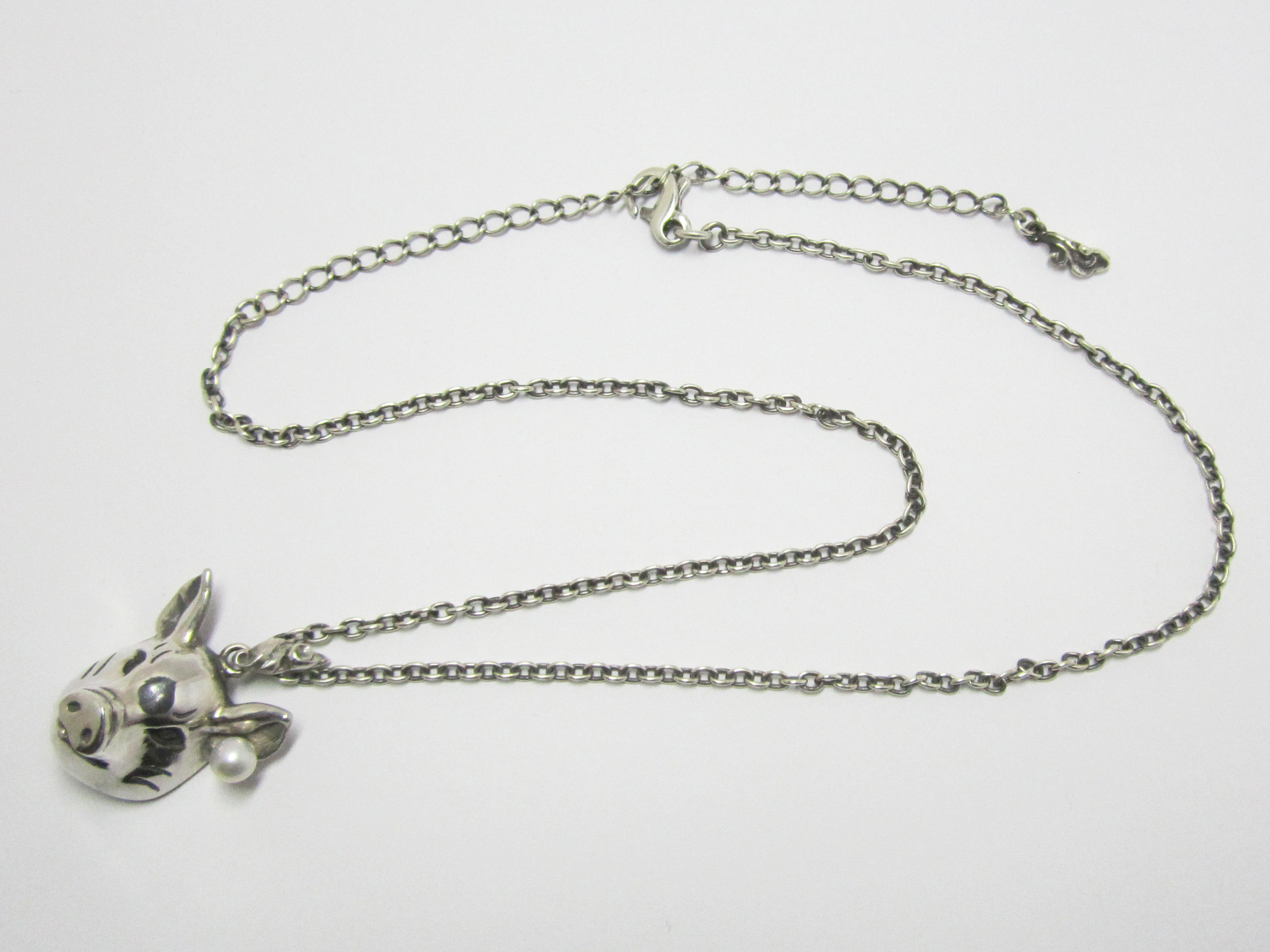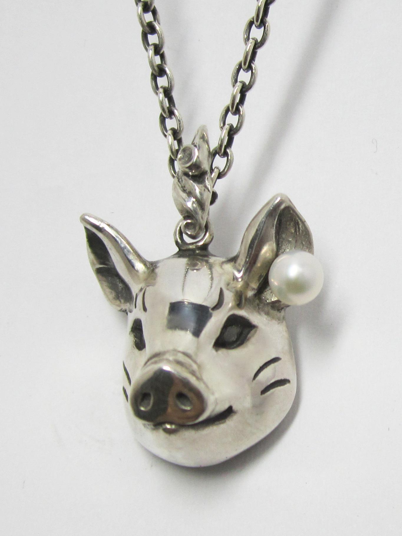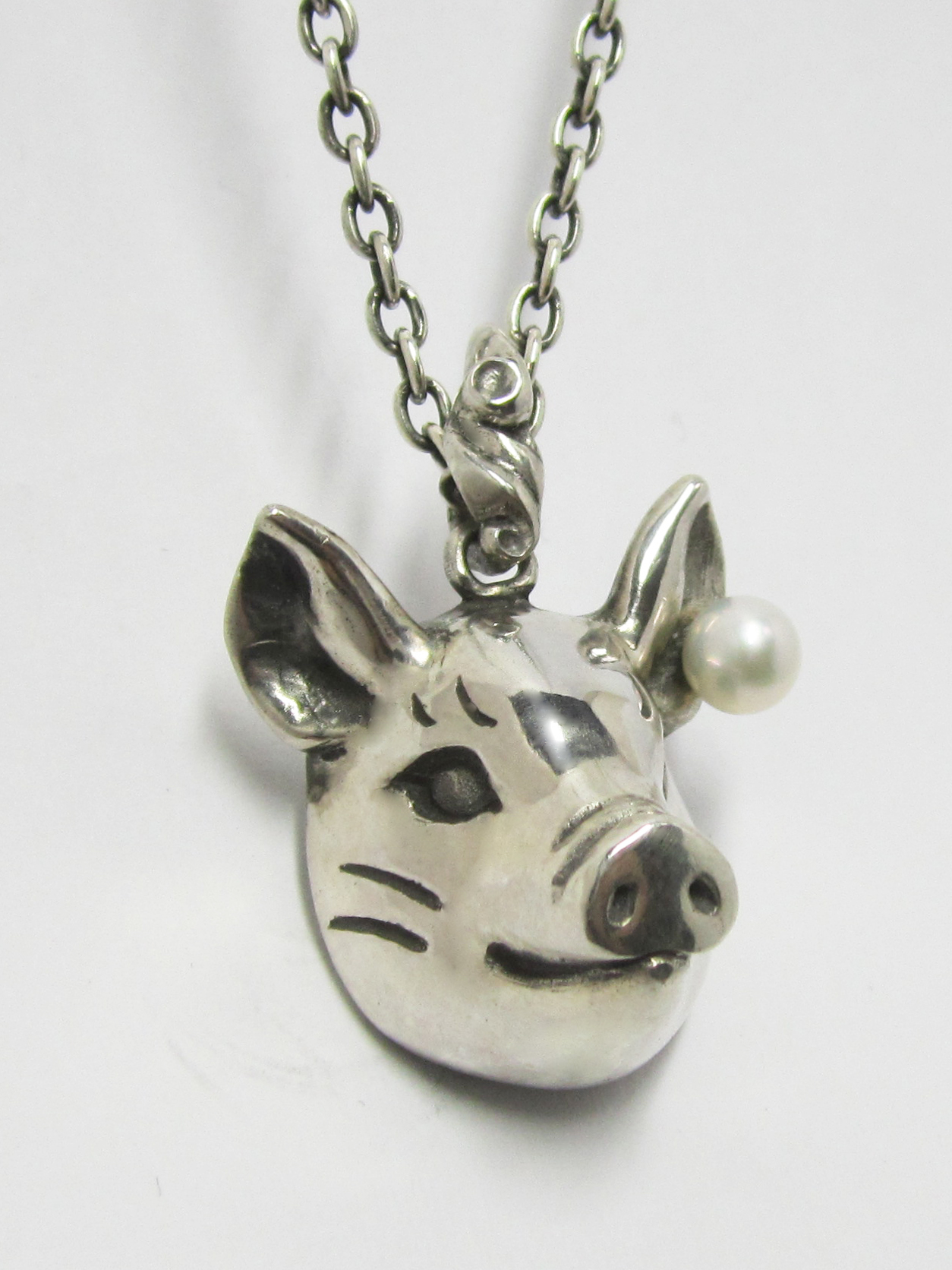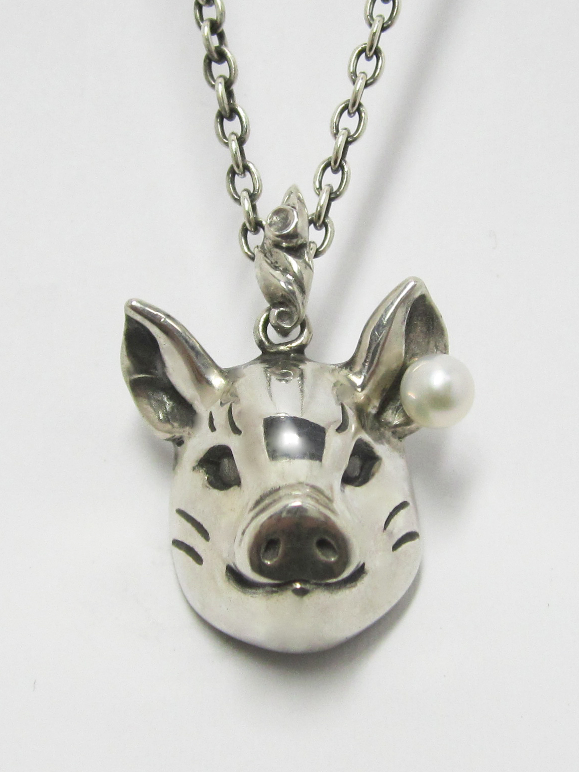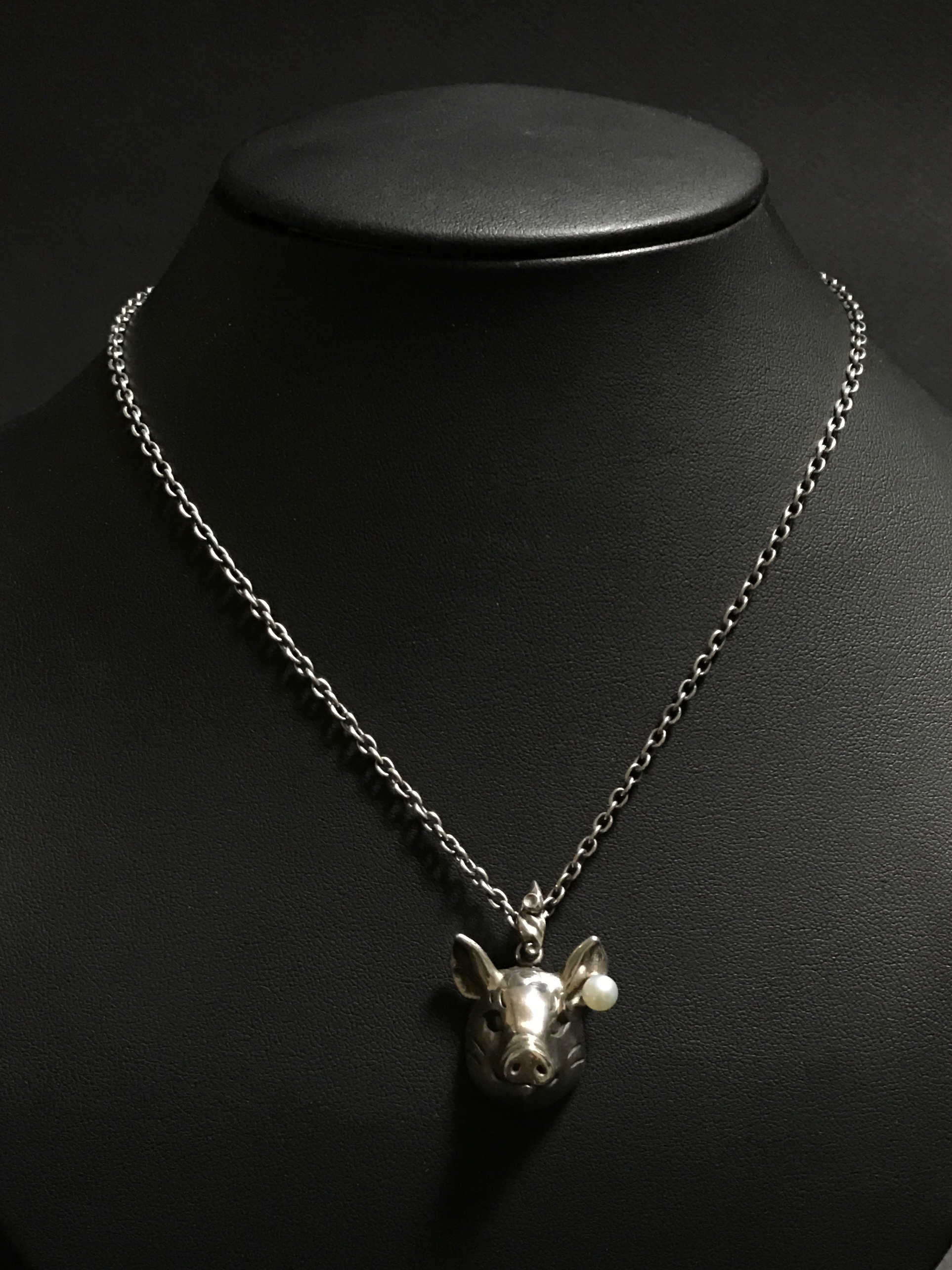 こちらのネックレスは男女兼用でご使用いただけます。 アジャスター(長さ調整留め具)により装着時に長さを変えられます。 素材 SILVER925/アコヤ本真珠 アコヤ本真珠(直径4.5mm) ペンダントトップ 縦25mm 横25mm (豚 /バチカンを含まない) チェーン 400mm |