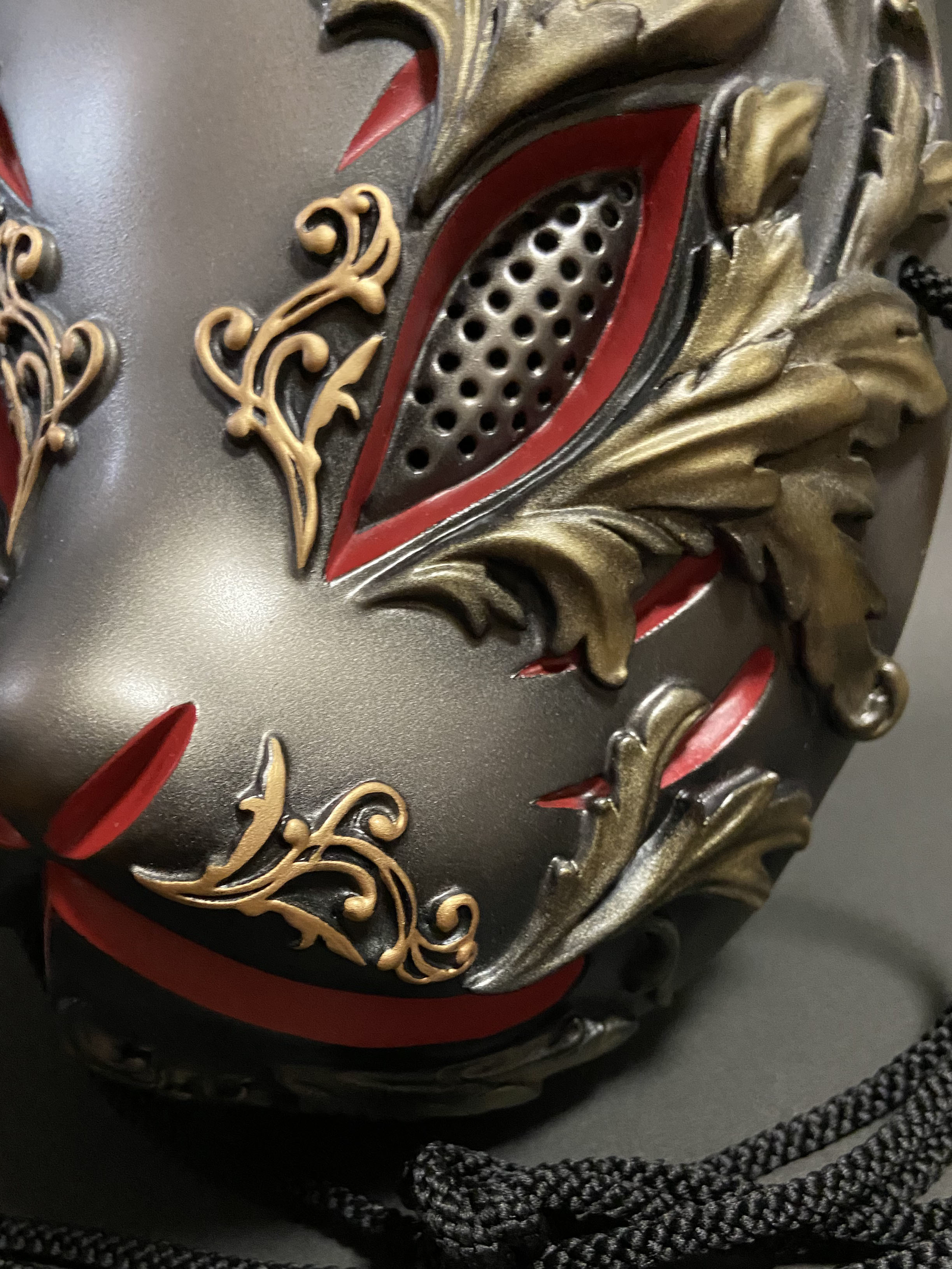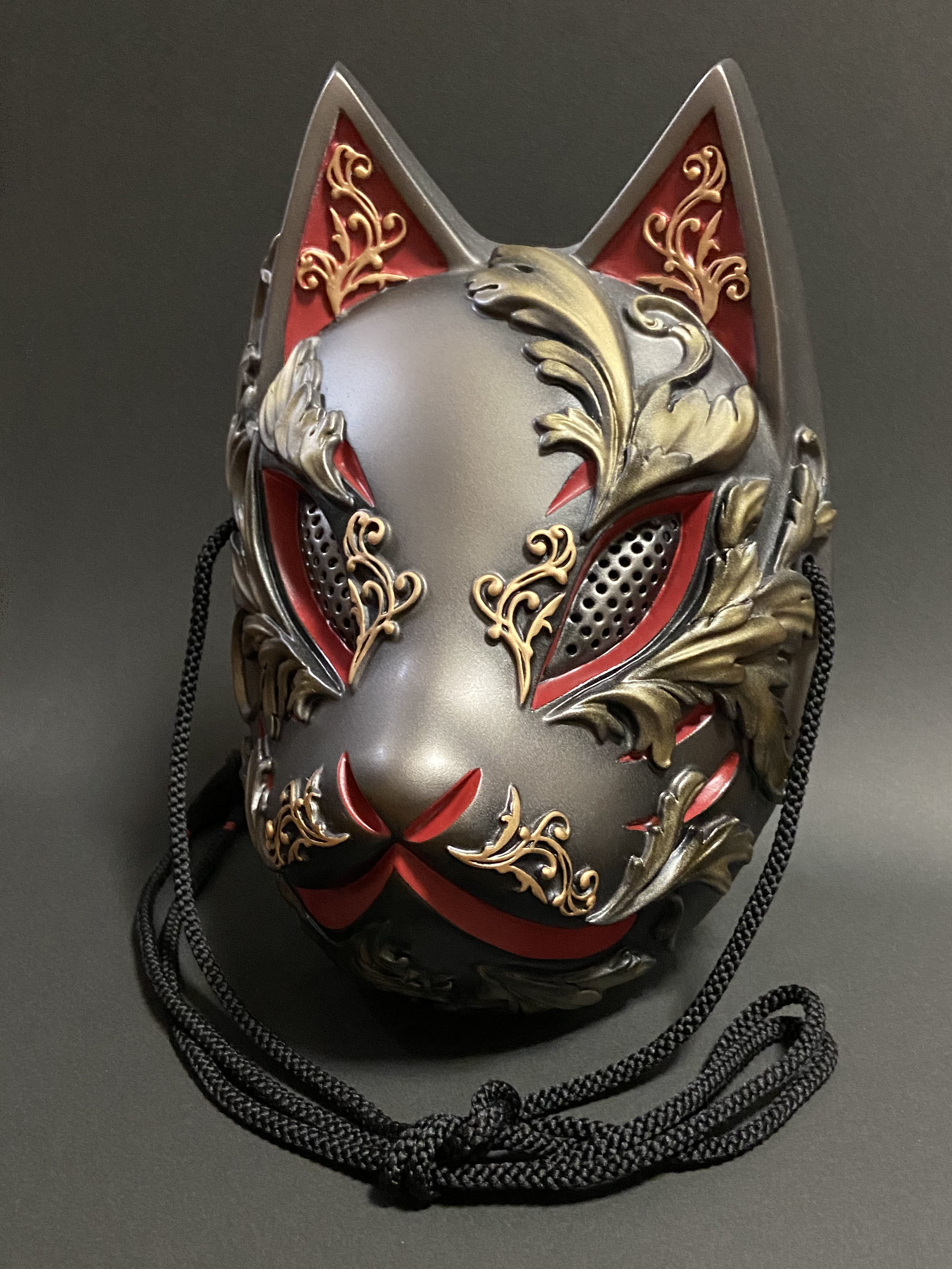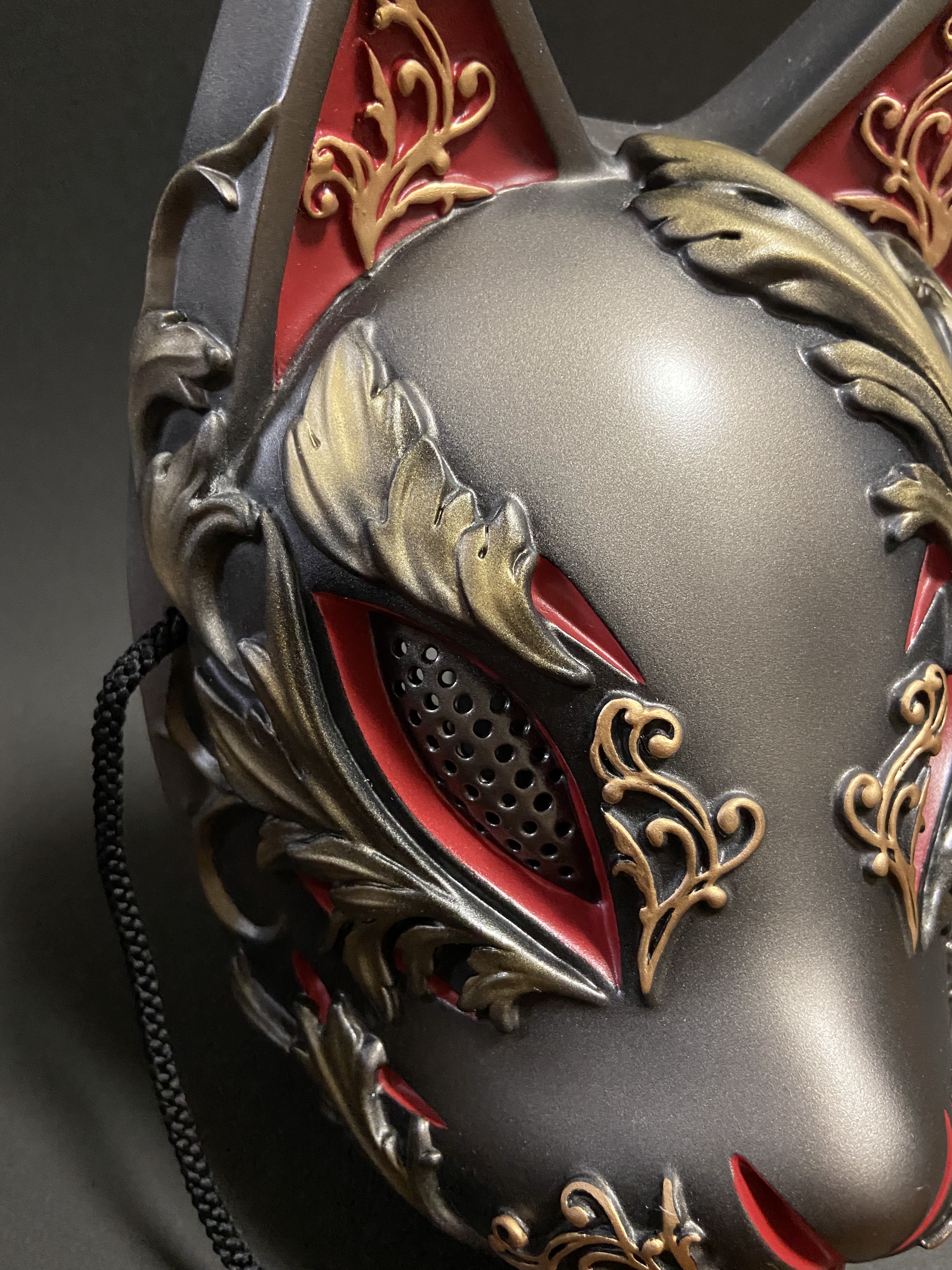 こちらの狐面には、ゴシック建築やギリシャ彫刻における代表的なモチーフである『アカンサス』の葉を、面全体にレリーフで装飾しております。