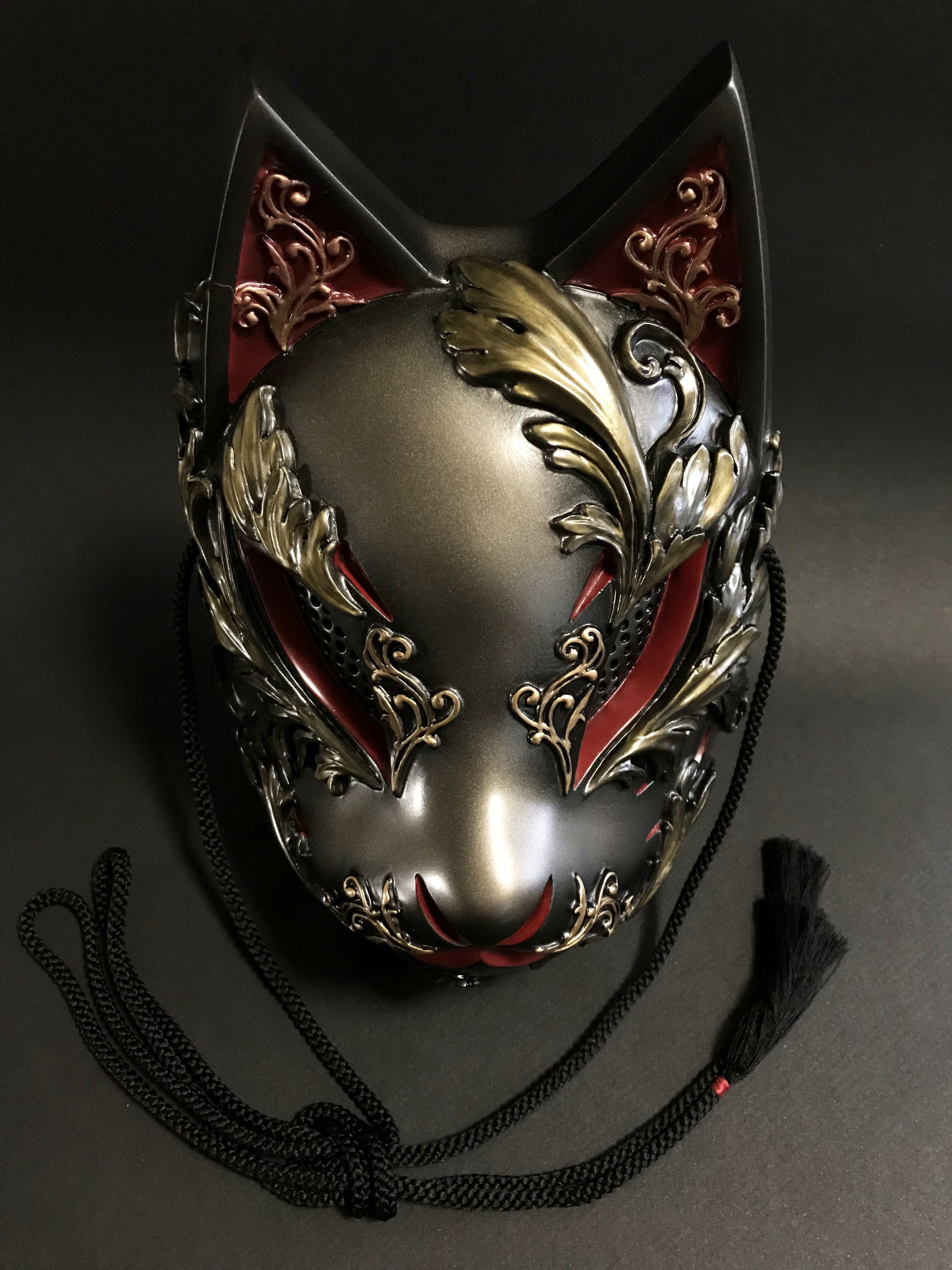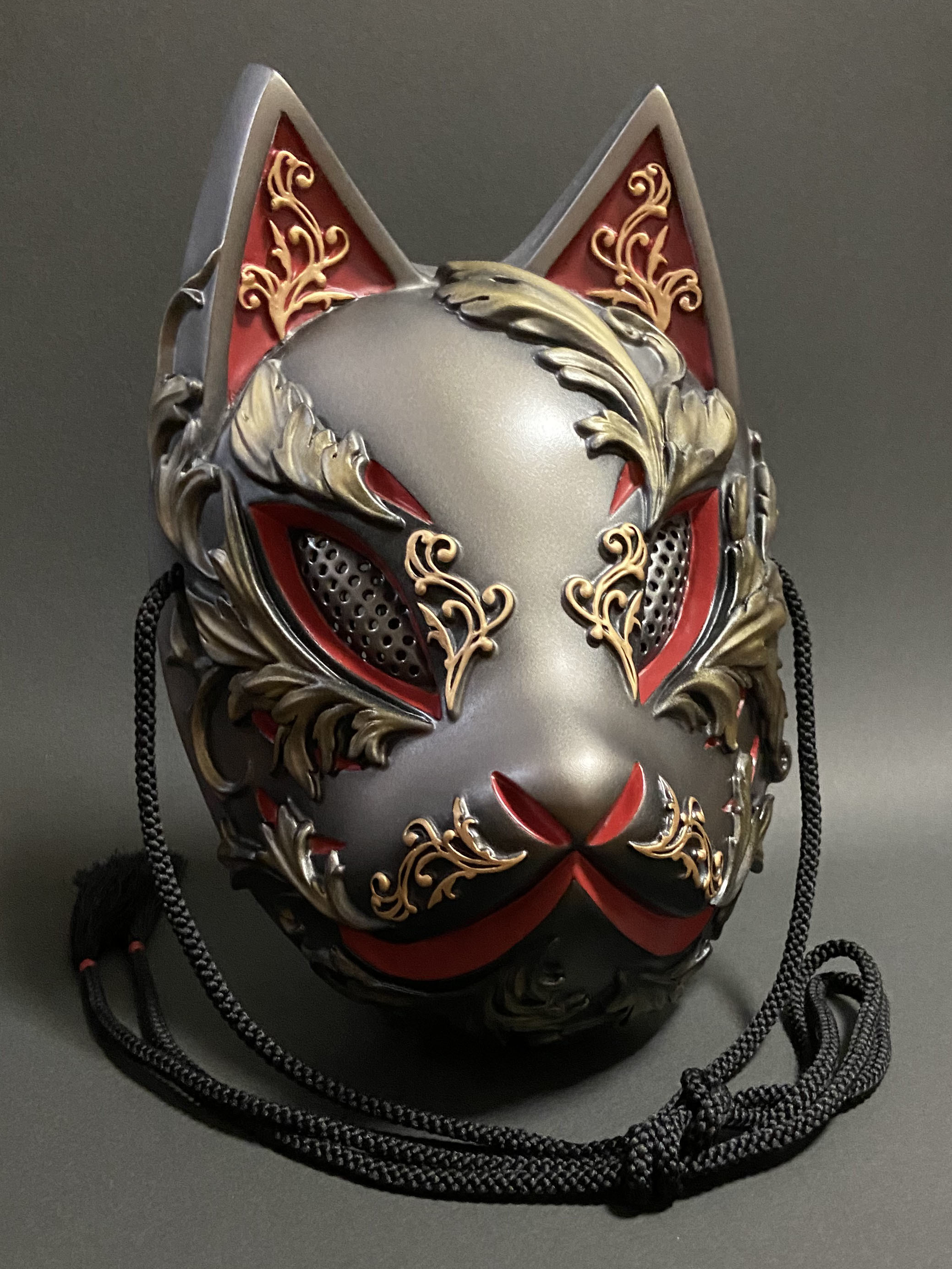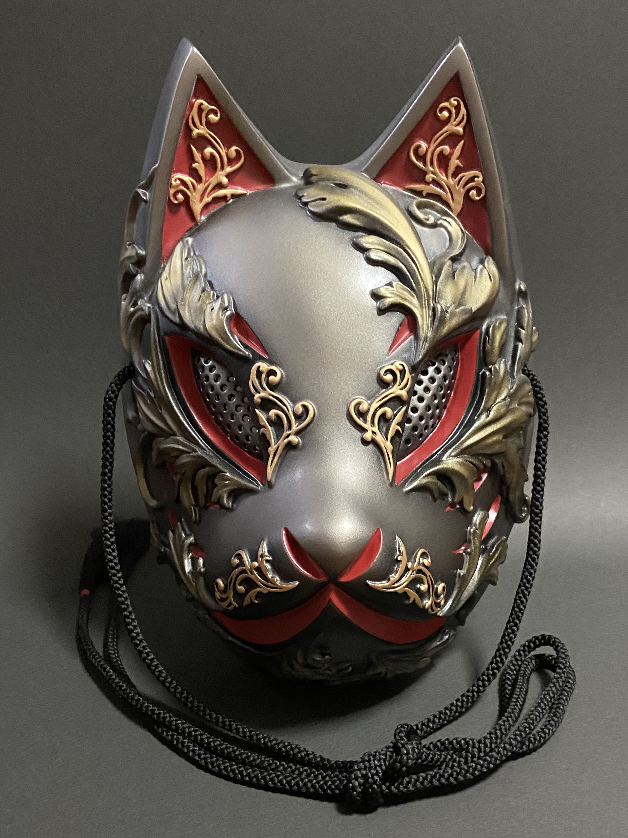 こちらの狐面には、ゴシック建築やギリシャ彫刻における代表的なモチーフである『アカンサス』の葉を、面全体にレリーフで装飾しております。