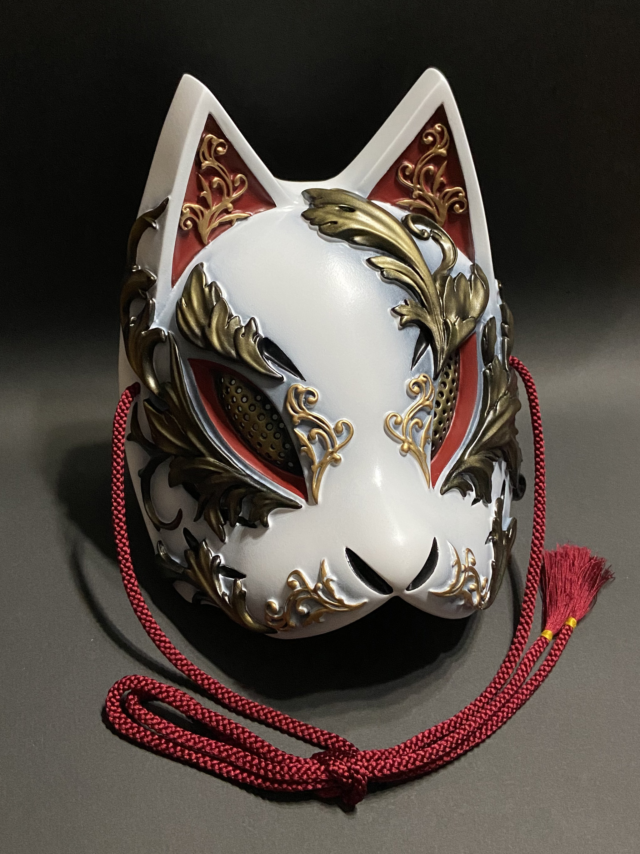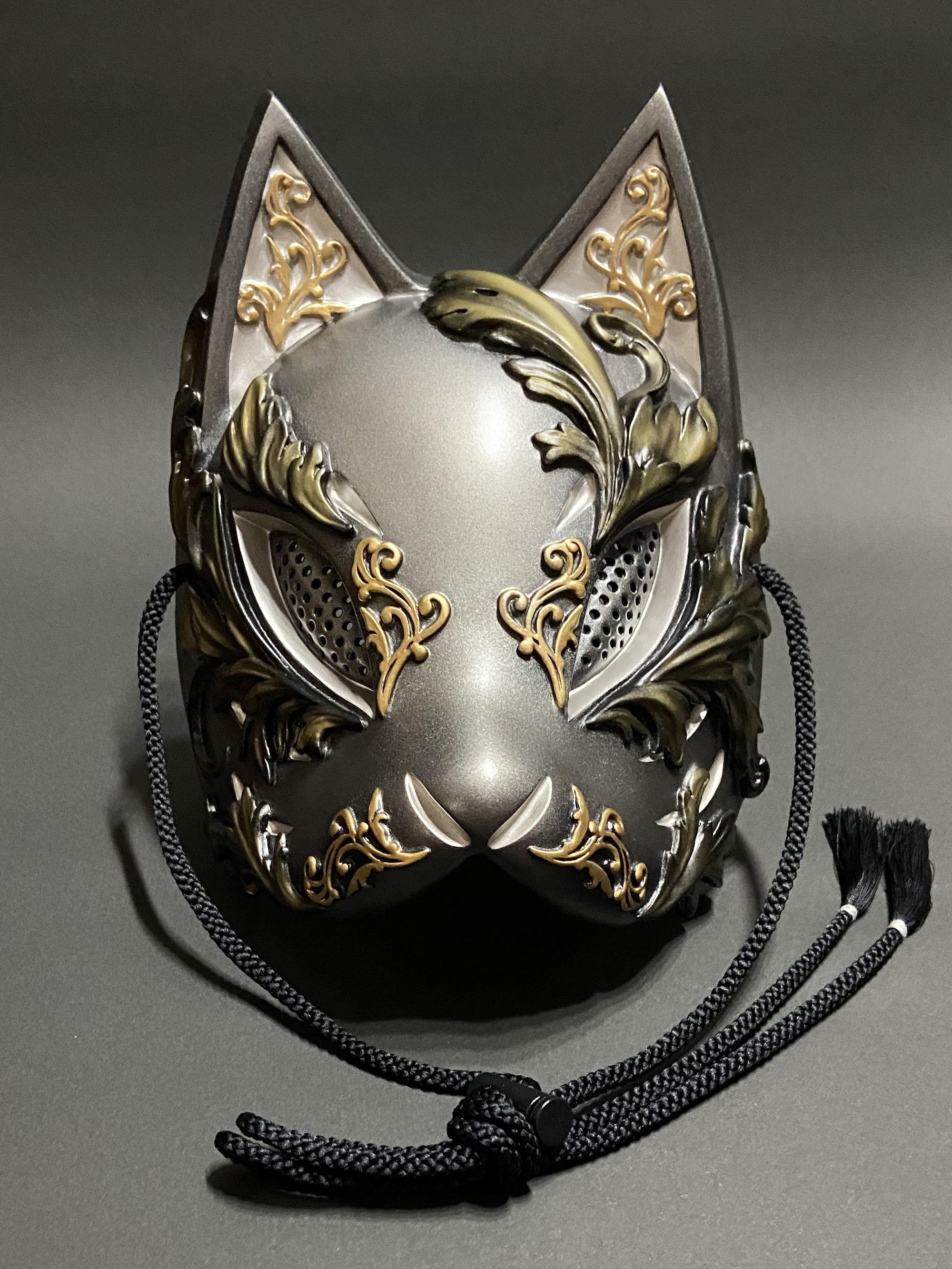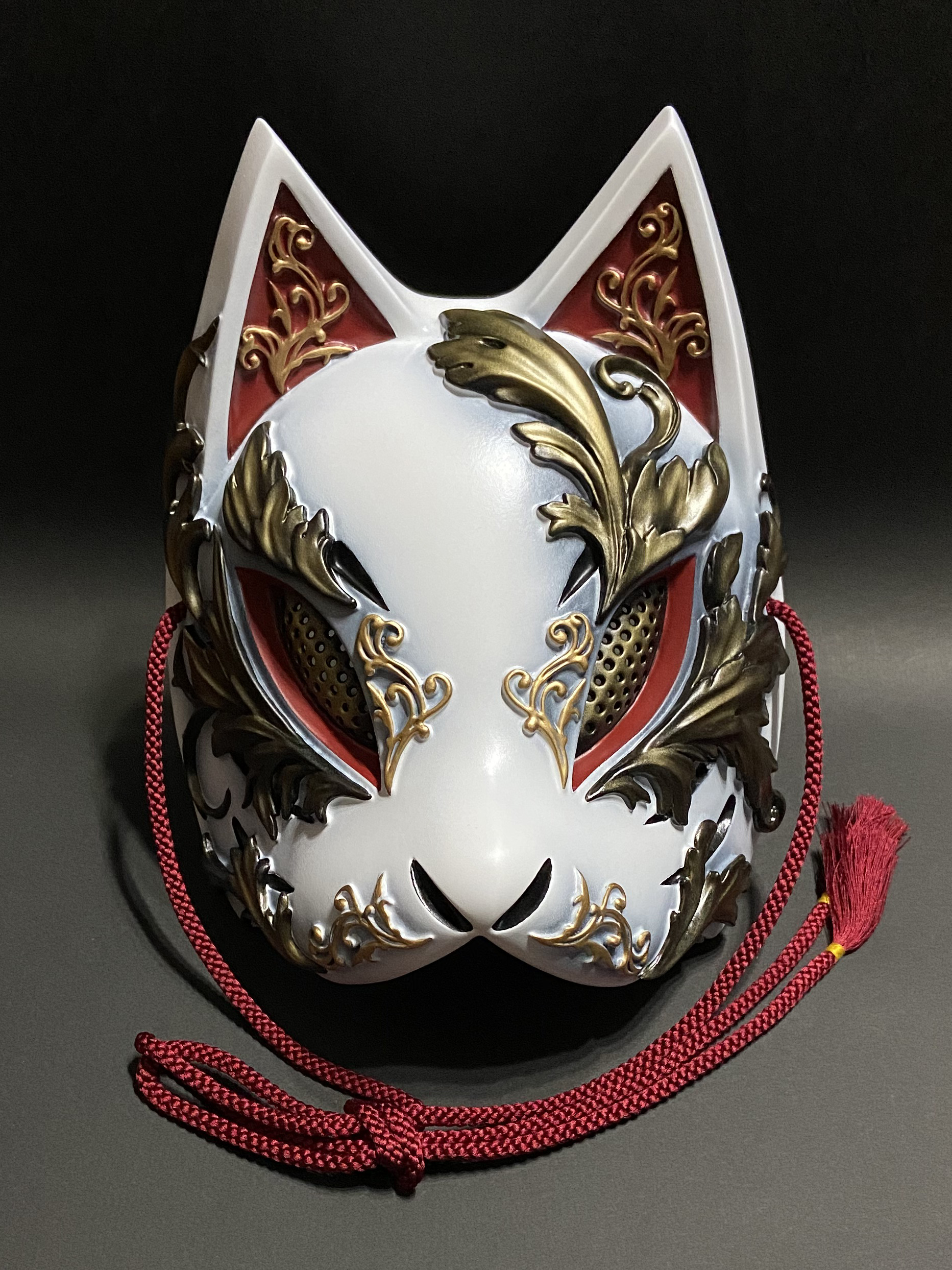 こちらの狐面には、ゴシック建築やギリシャ彫刻における代表的なモチーフである『アカンサス』の葉を、面全体にレリーフで装飾しております。