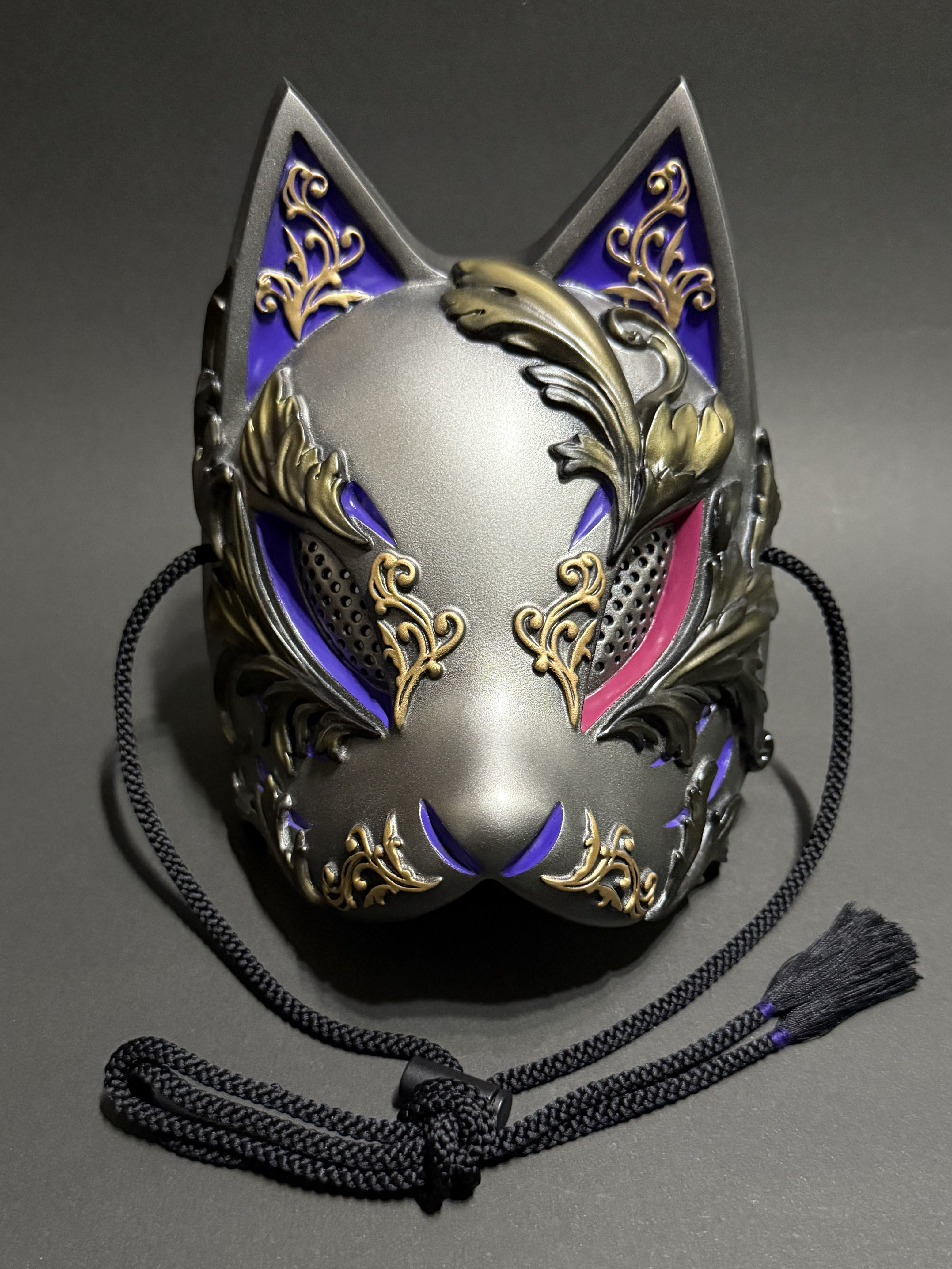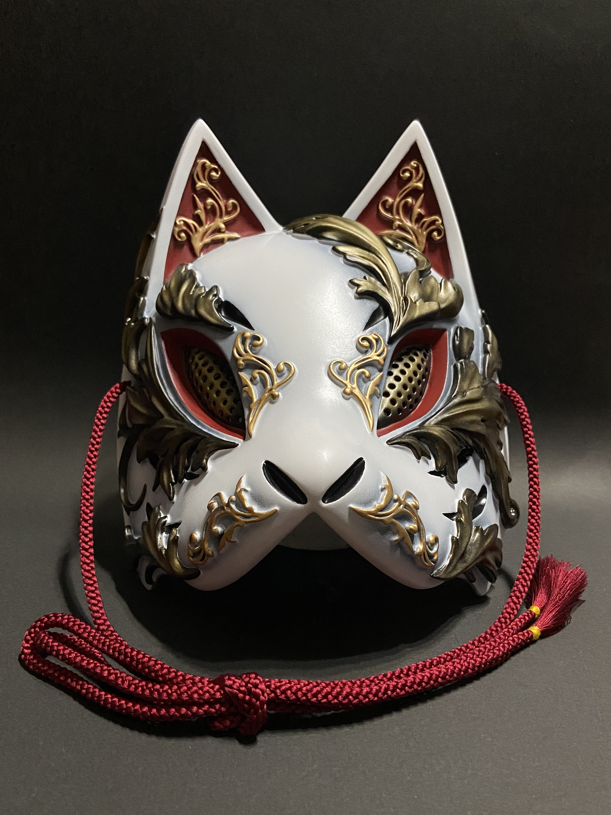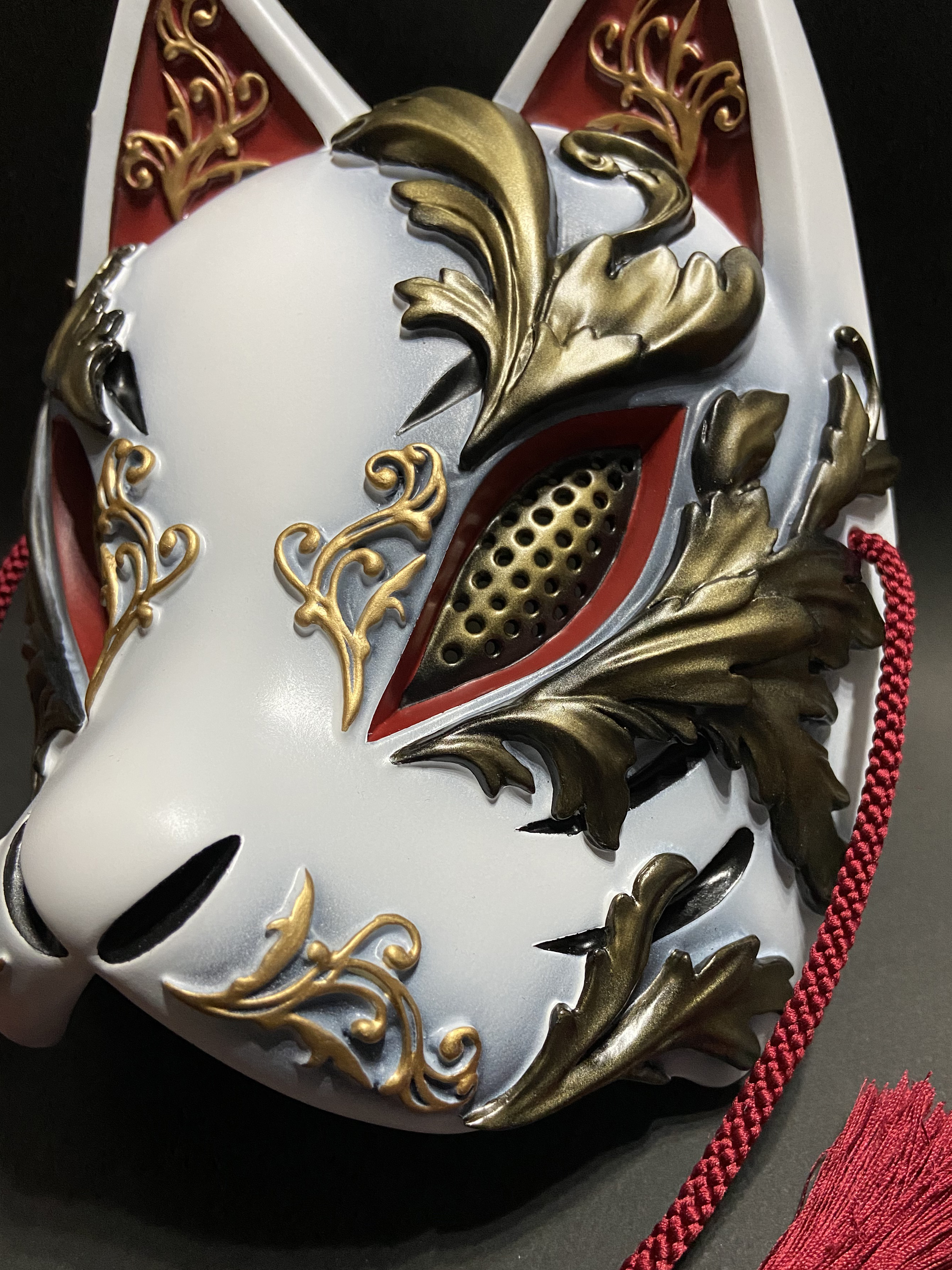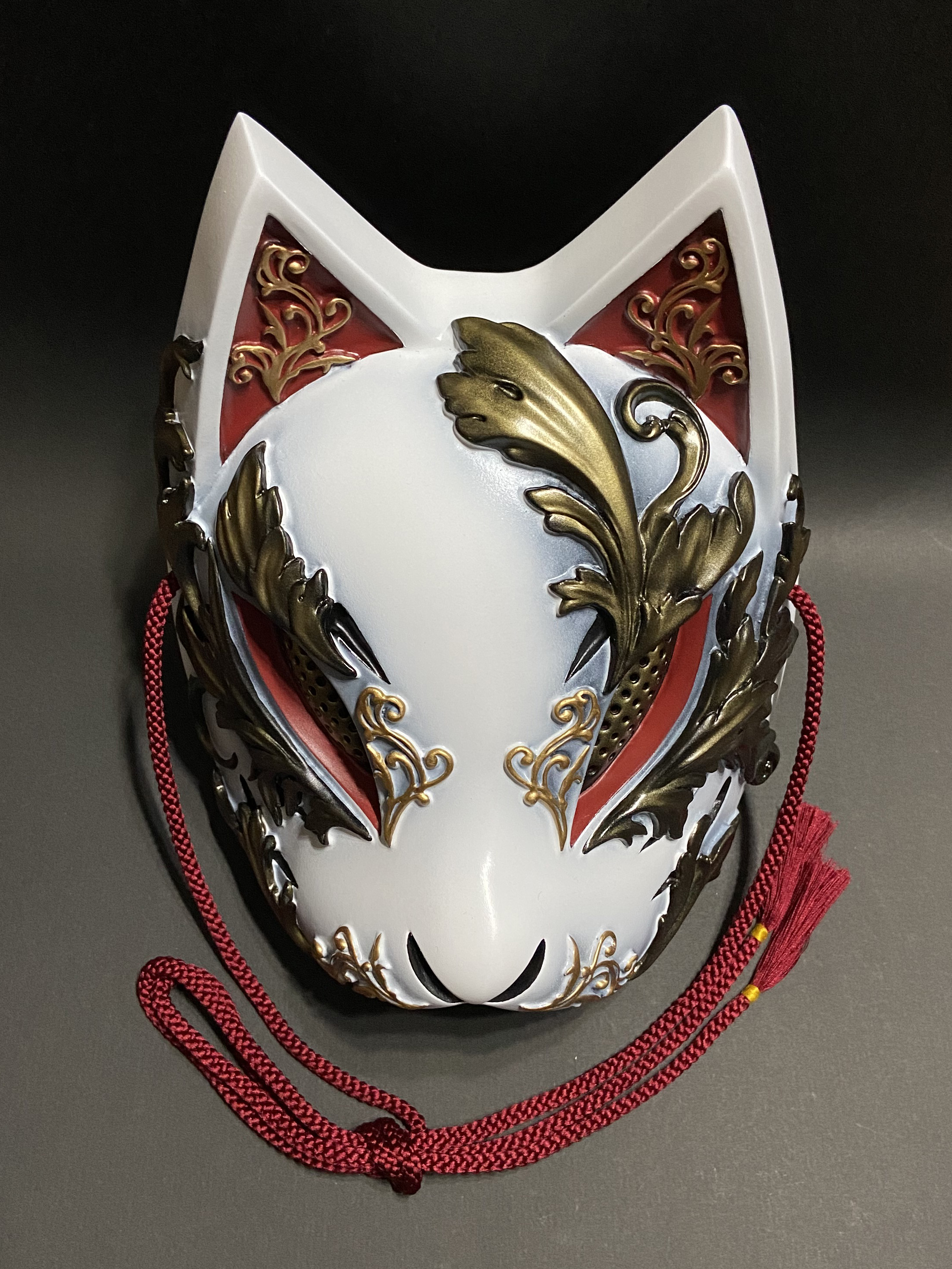 こちらの狐面には、ゴシック建築やギリシャ彫刻における代表的なモチーフである『アカンサス』の葉を、面全体にレリーフで装飾しております。