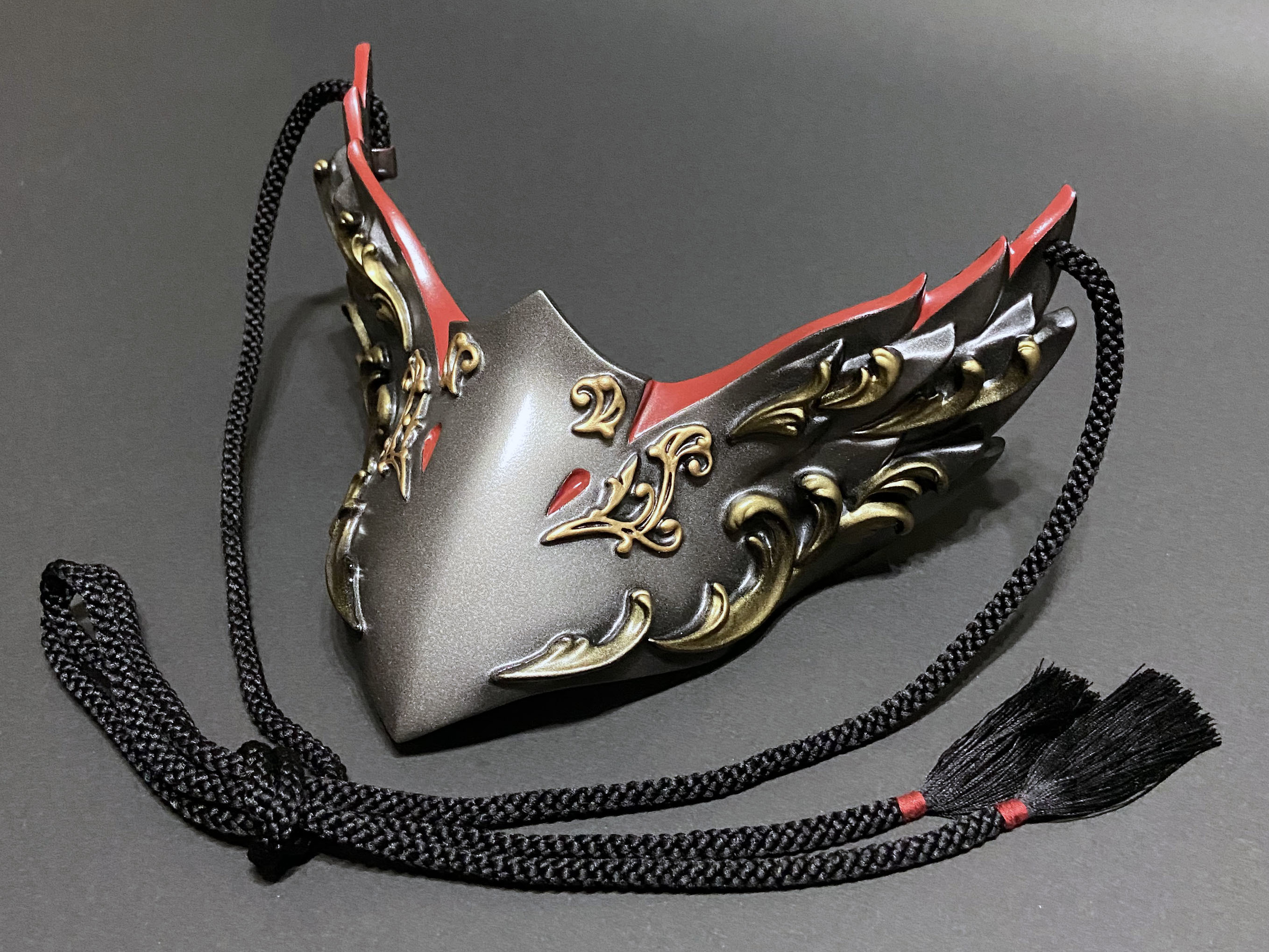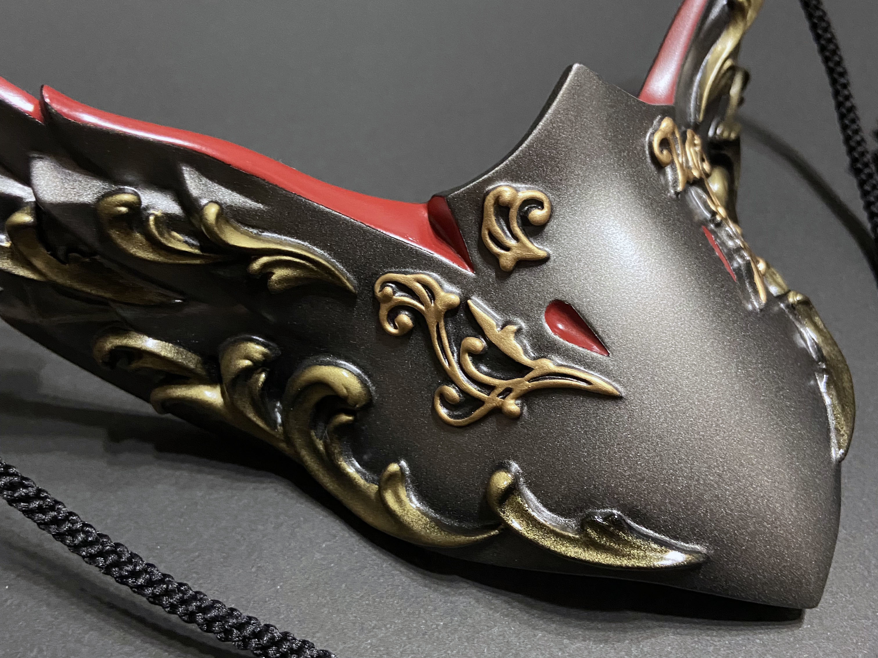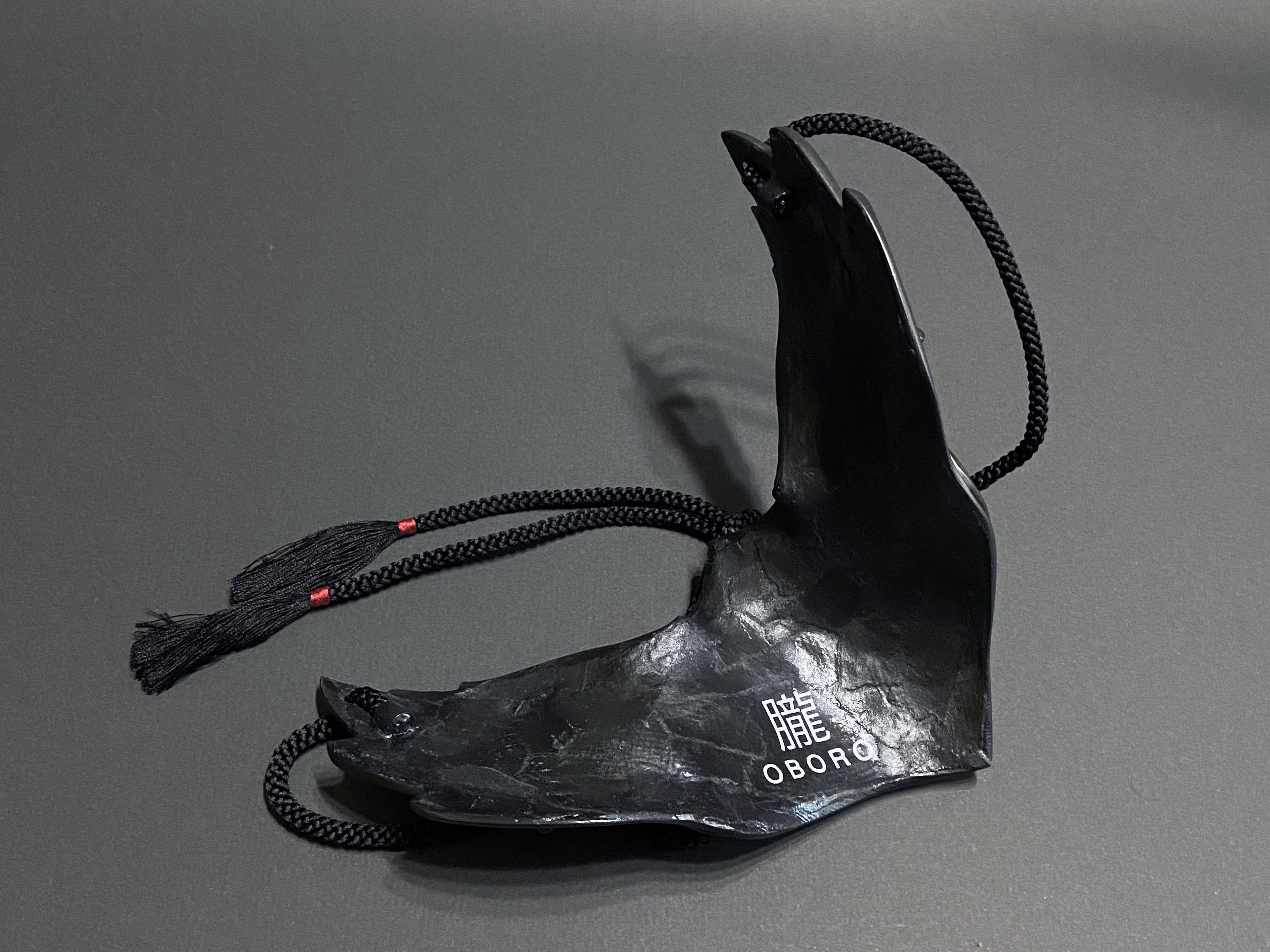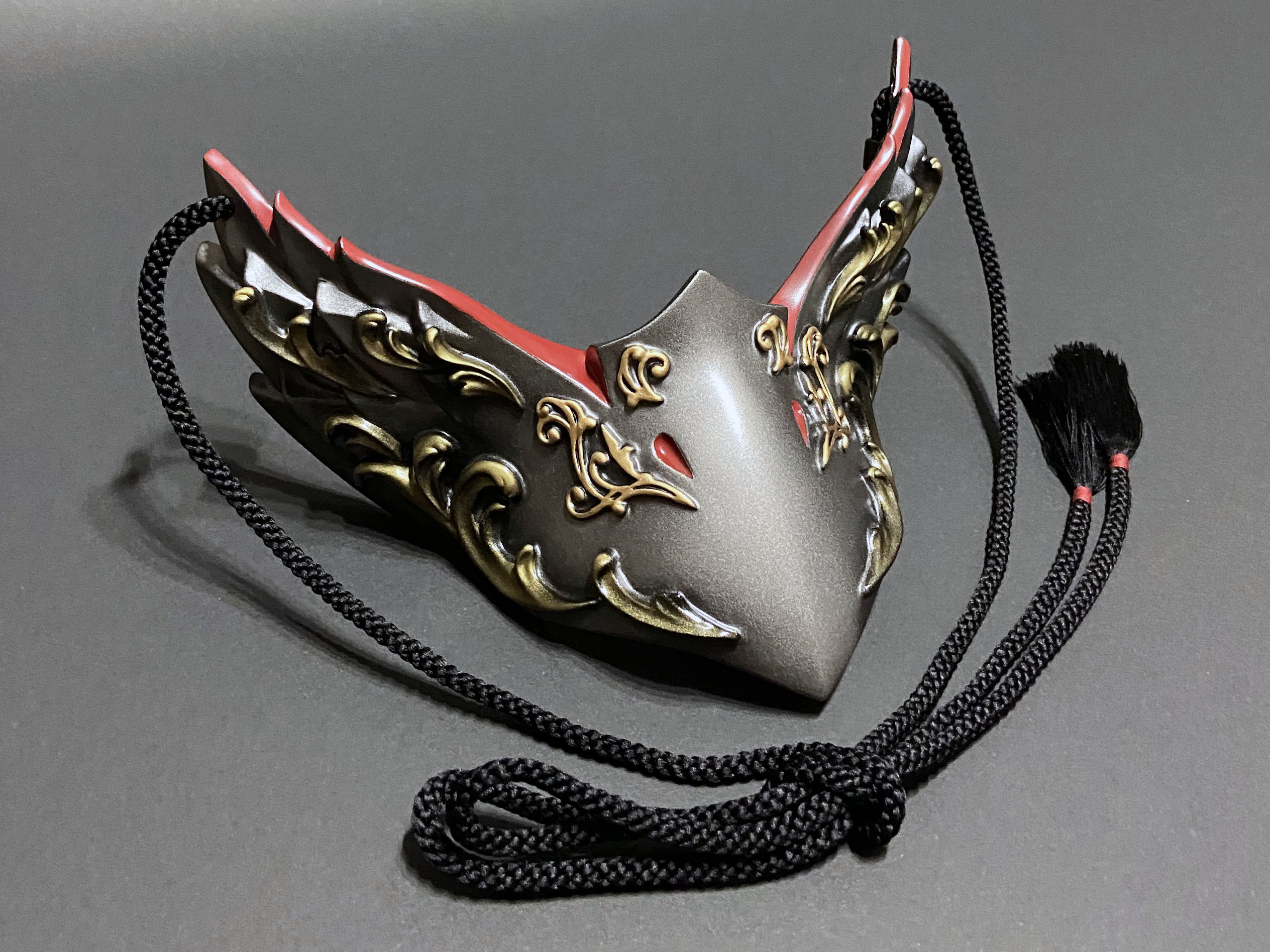 こちらの烏面には、ゴシック建築やギリシャ彫刻における代表的なモチーフである『アカンサス』の葉を、面全体にレリーフで装飾しております。