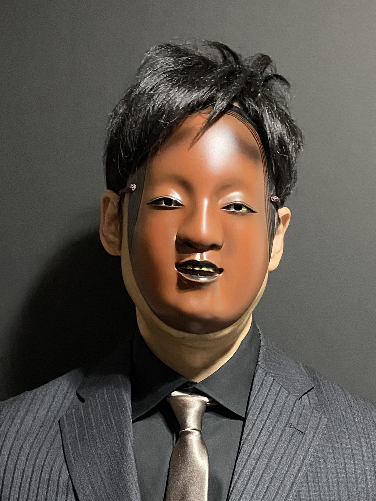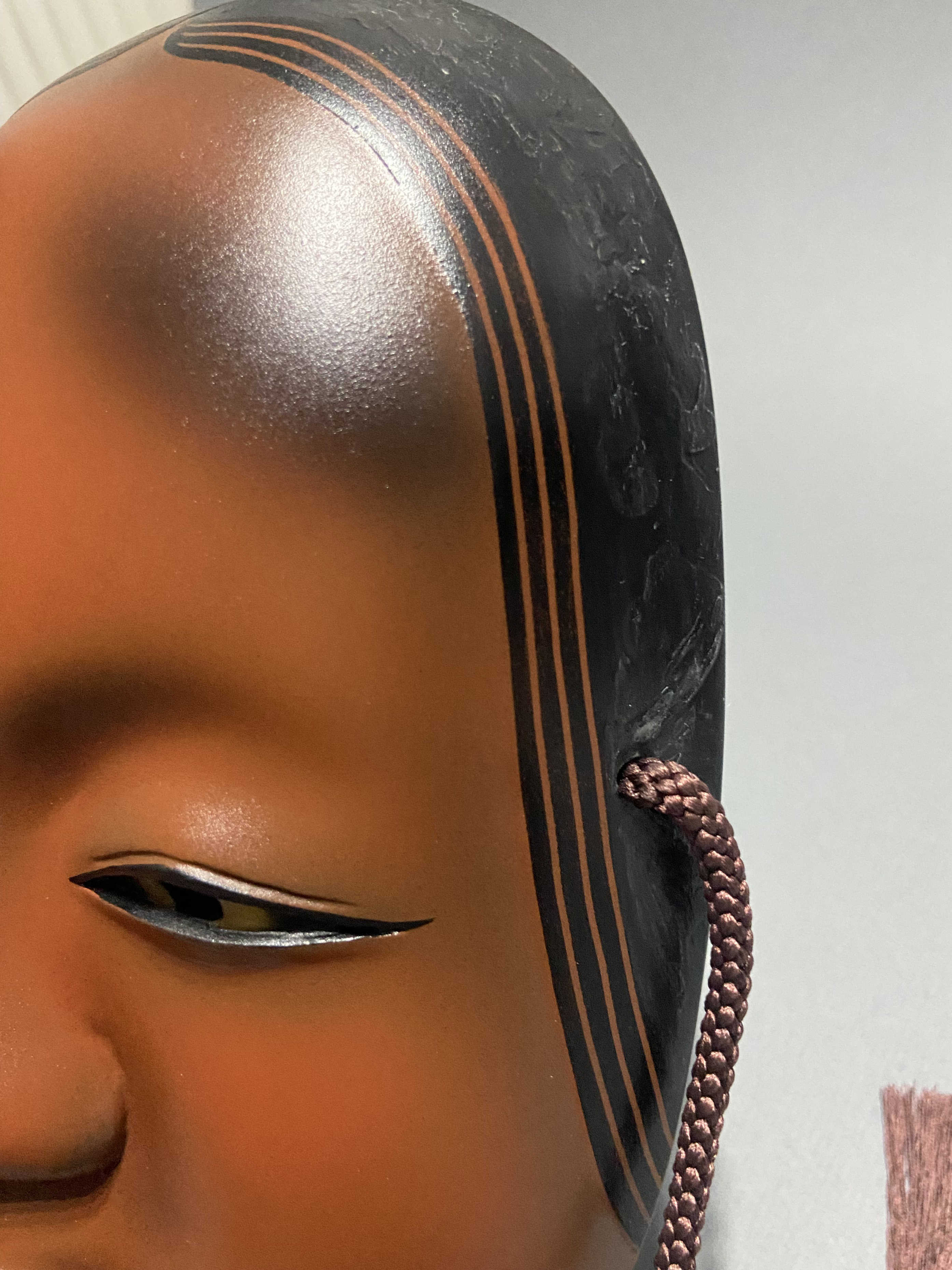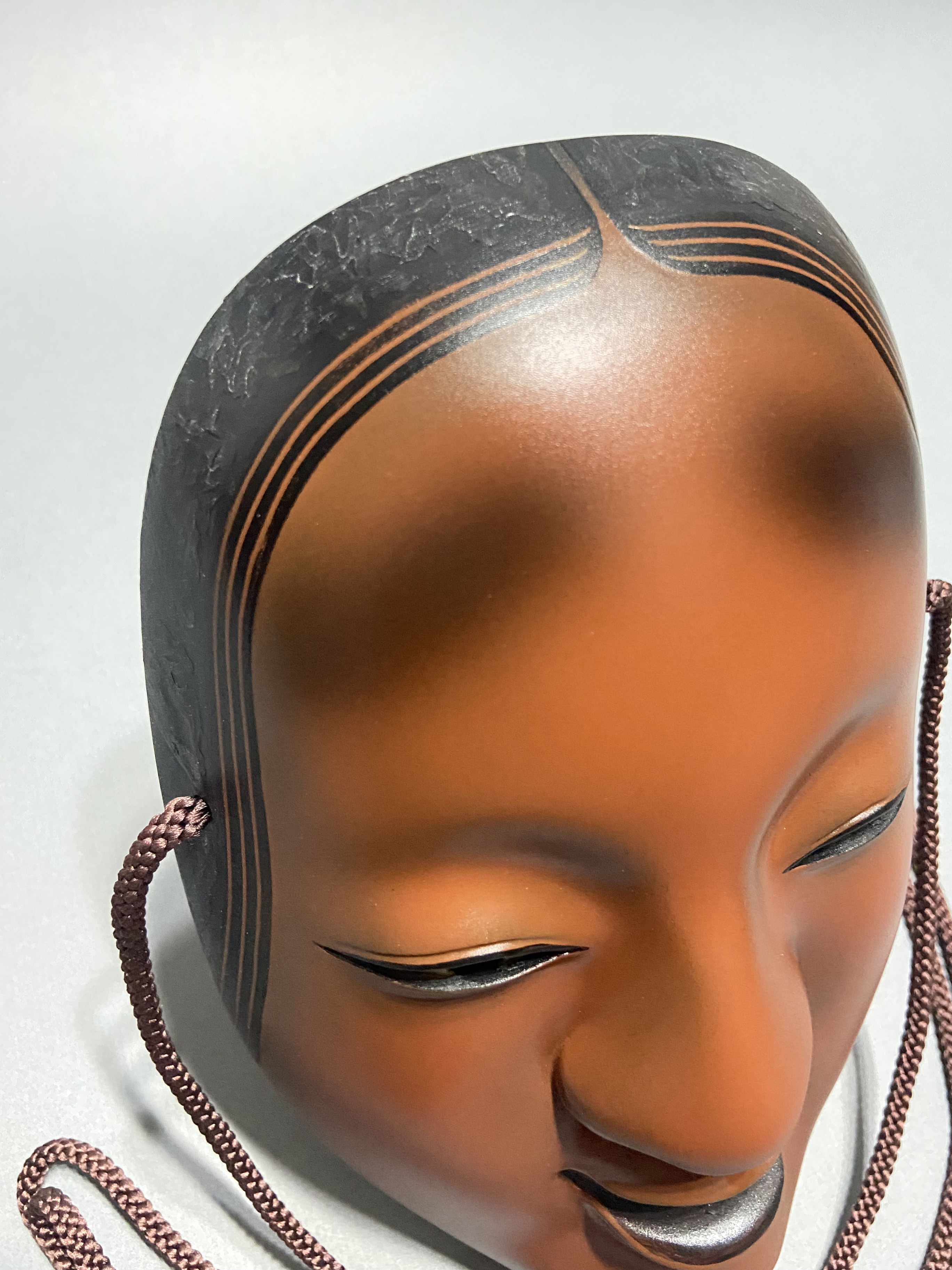 一般的に現代の能面師の方々が作られる能面は、使い古したような風合いを与えて制作されることが多いようなので、この作品も髪の毛の部分には経年劣化のような風合いを施し、唇の着色は、敢えてムラのある塗り方をしております。