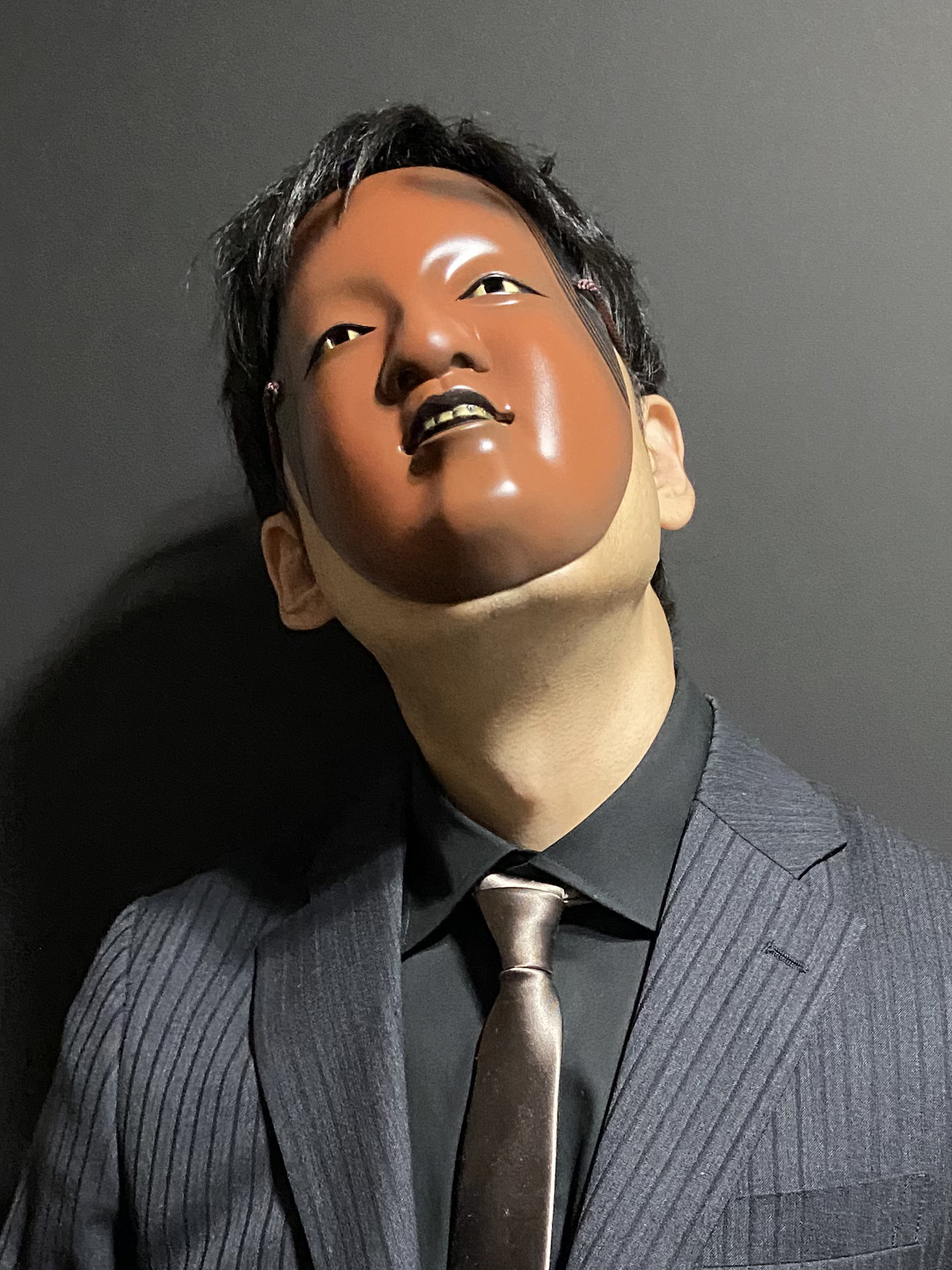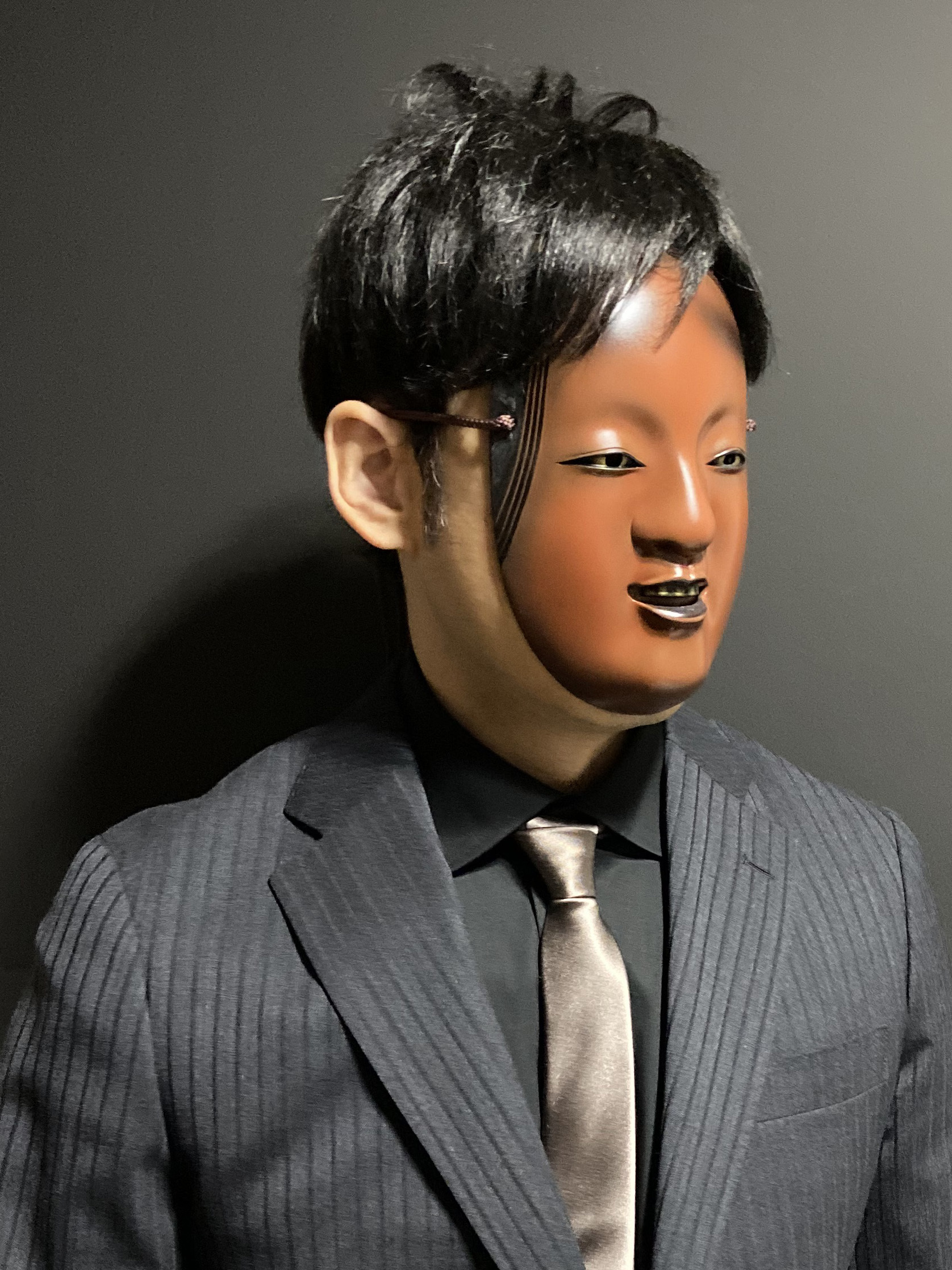 小面の大きな特徴として、平安時代の人々に見られた、眉を抜き、おでこの真ん中に眉を描く「引眉(ひきまゆ)」と、歯を黒く塗る「お歯黒」を表現されているのが印象的です。