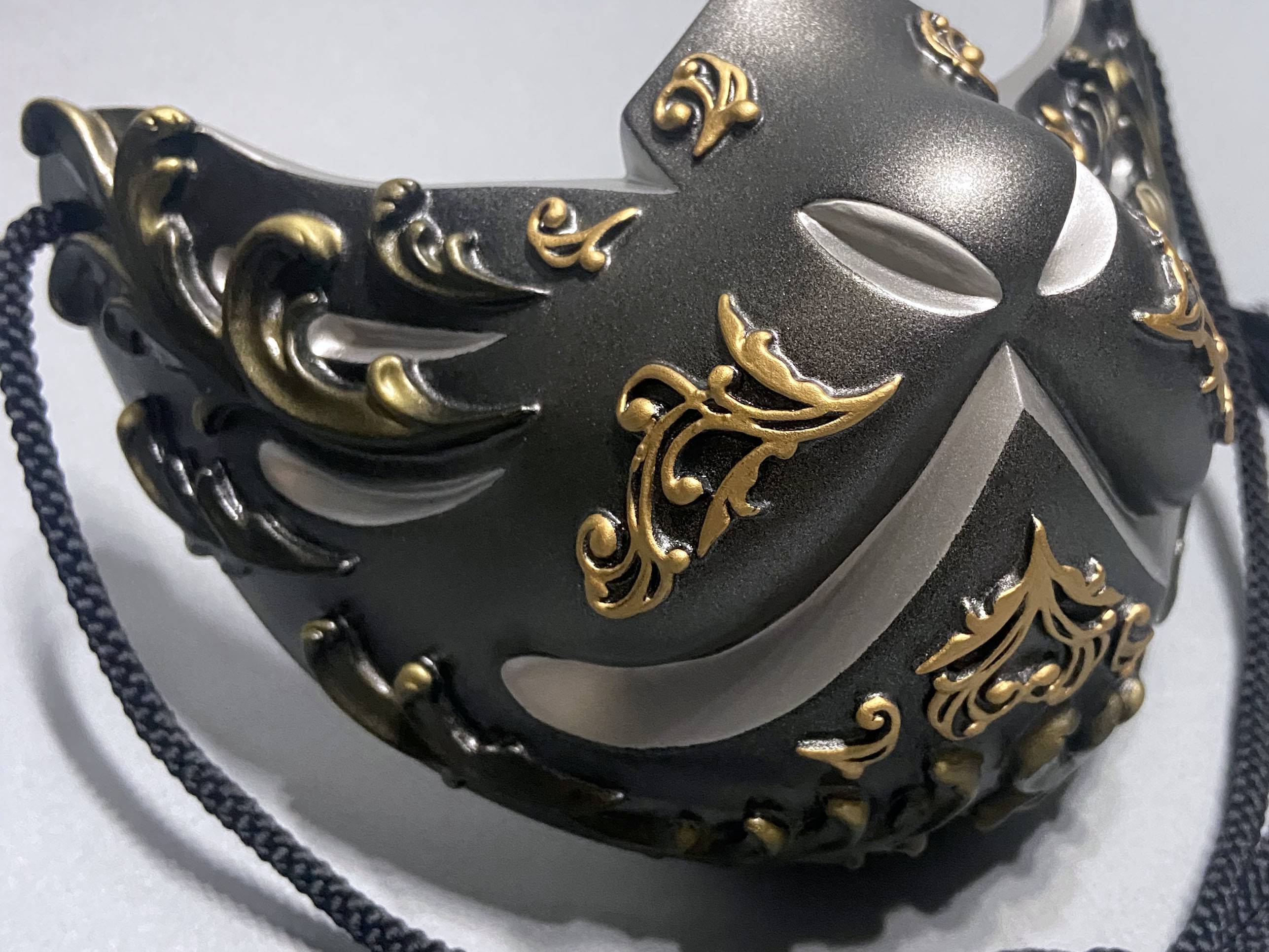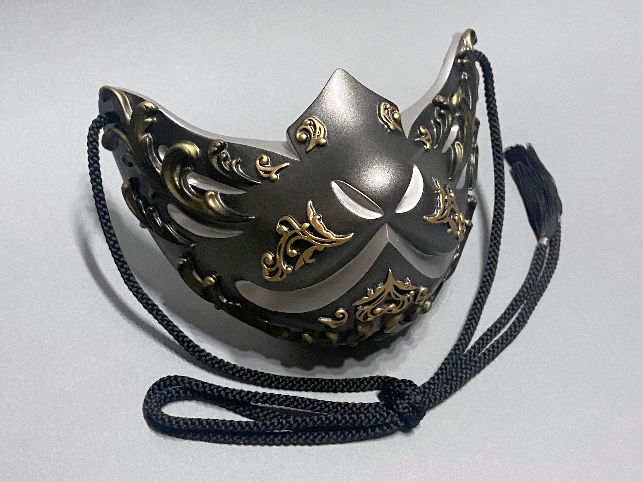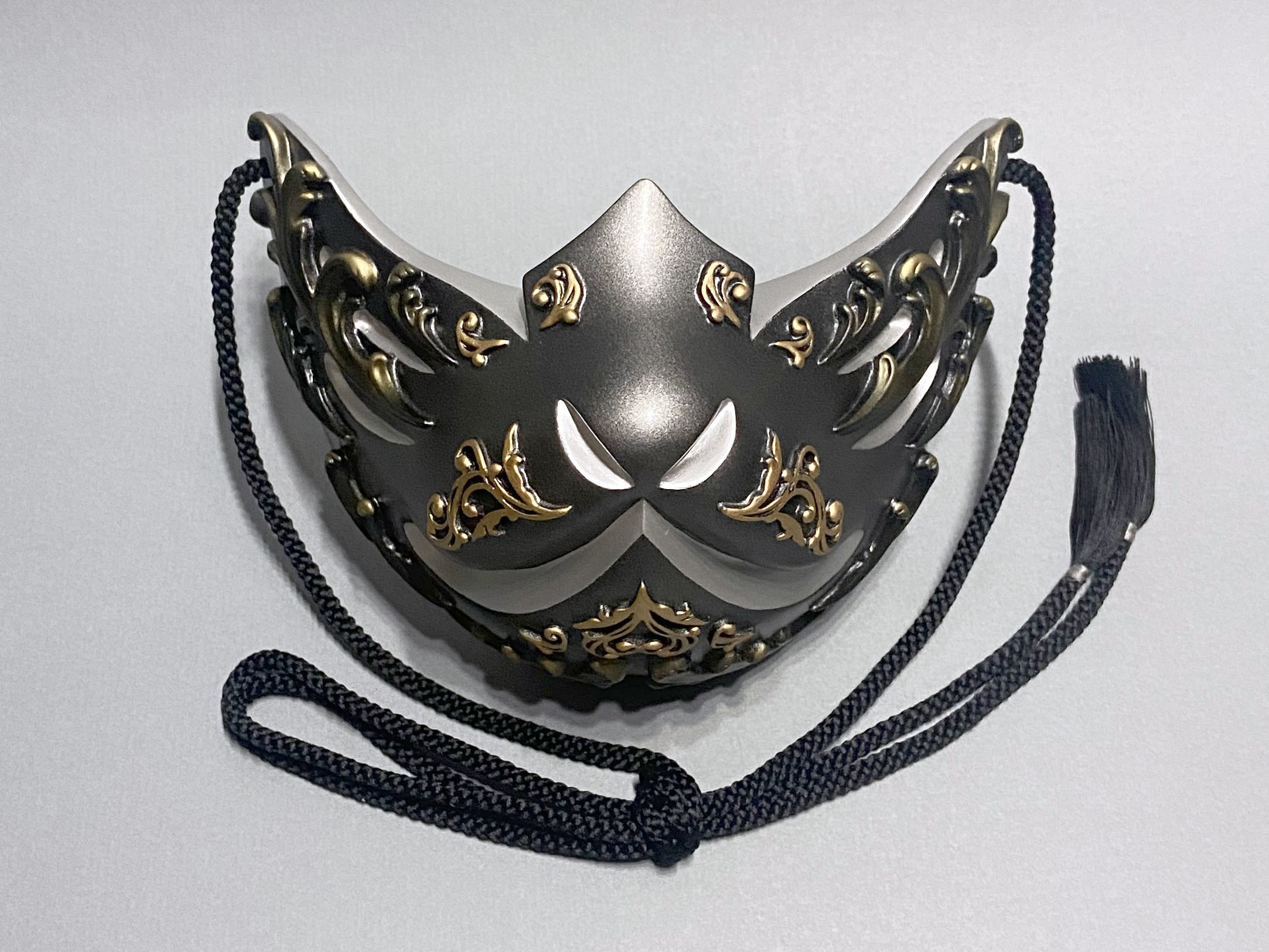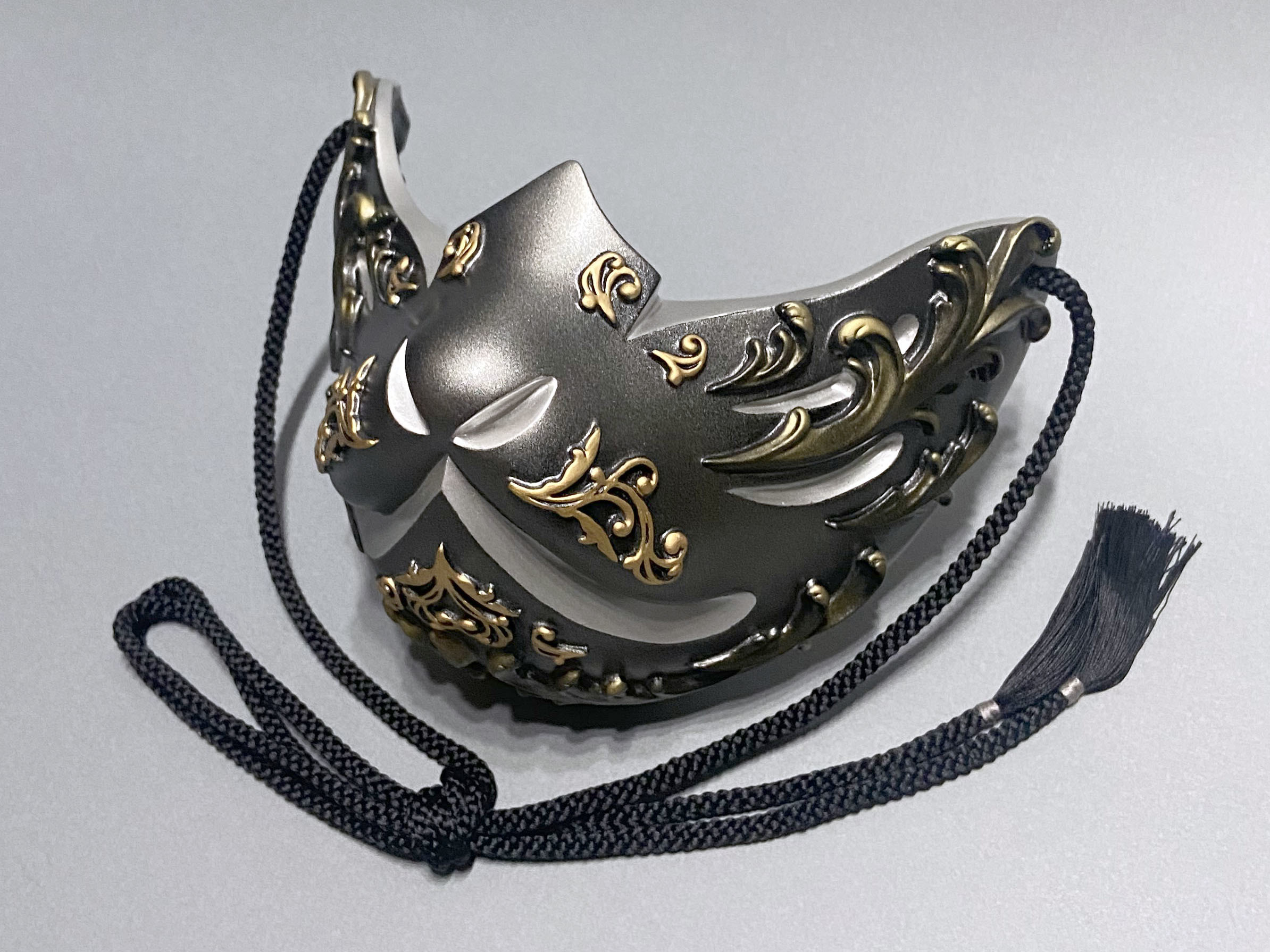 こちらの狐面には、ゴシック建築やギリシャ彫刻における代表的なモチーフである『アカンサス』の葉を、面全体にレリーフで装飾しております。