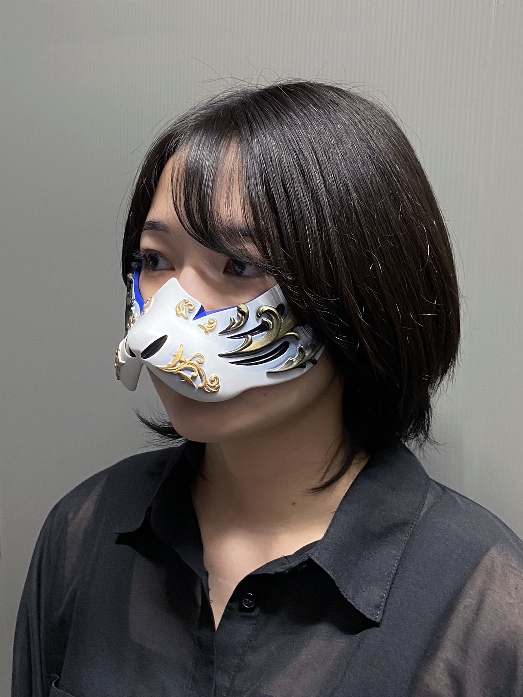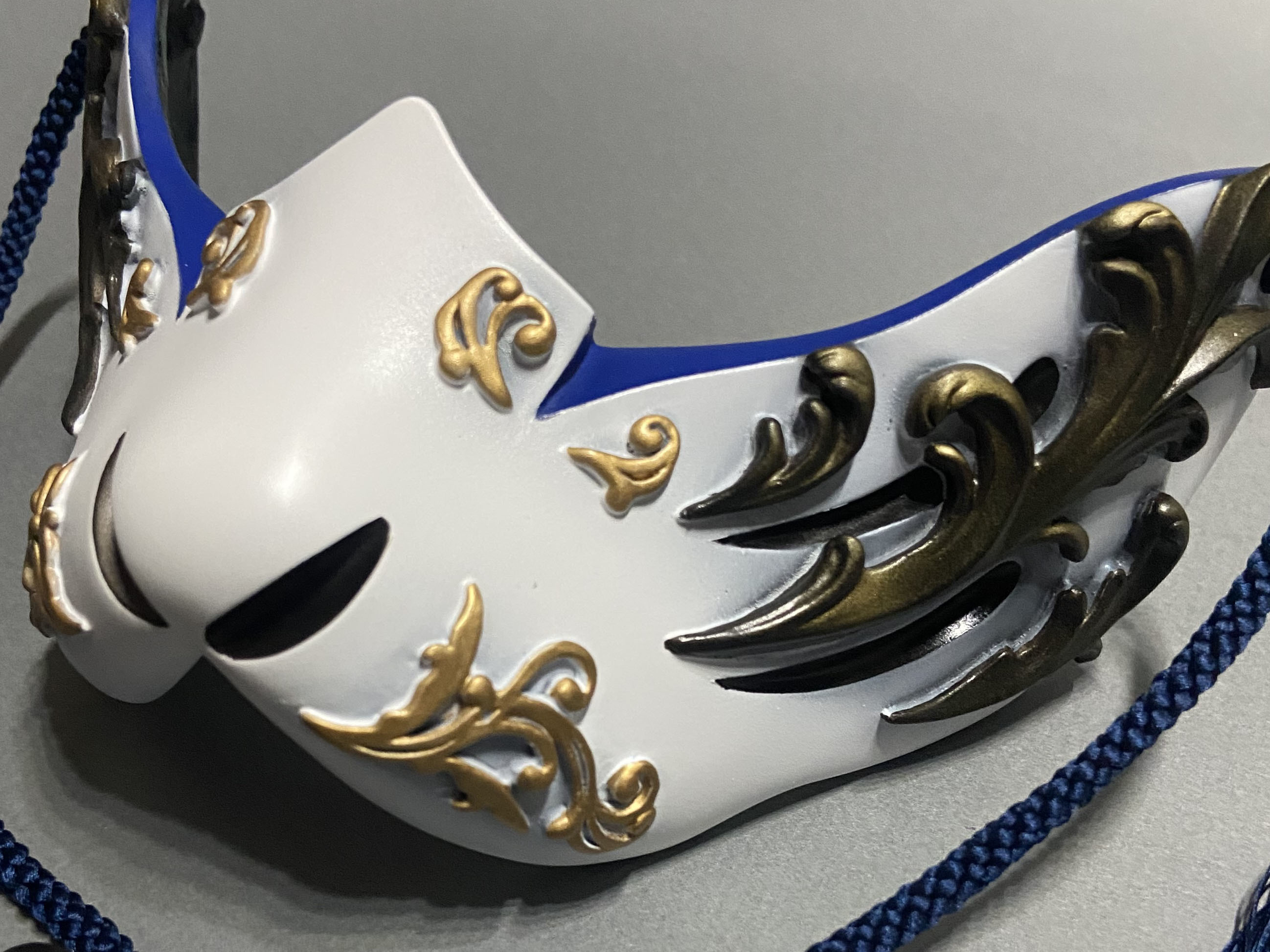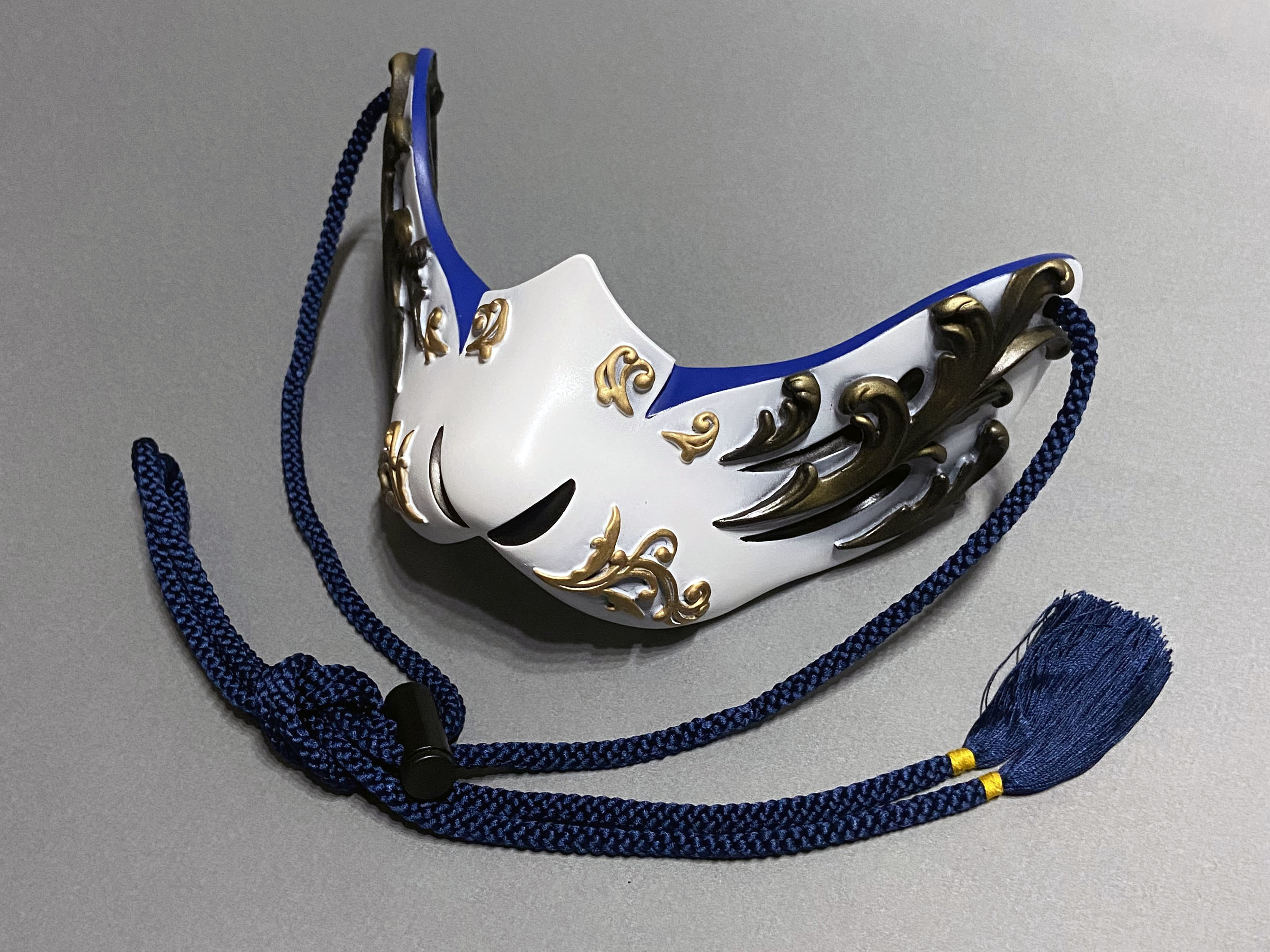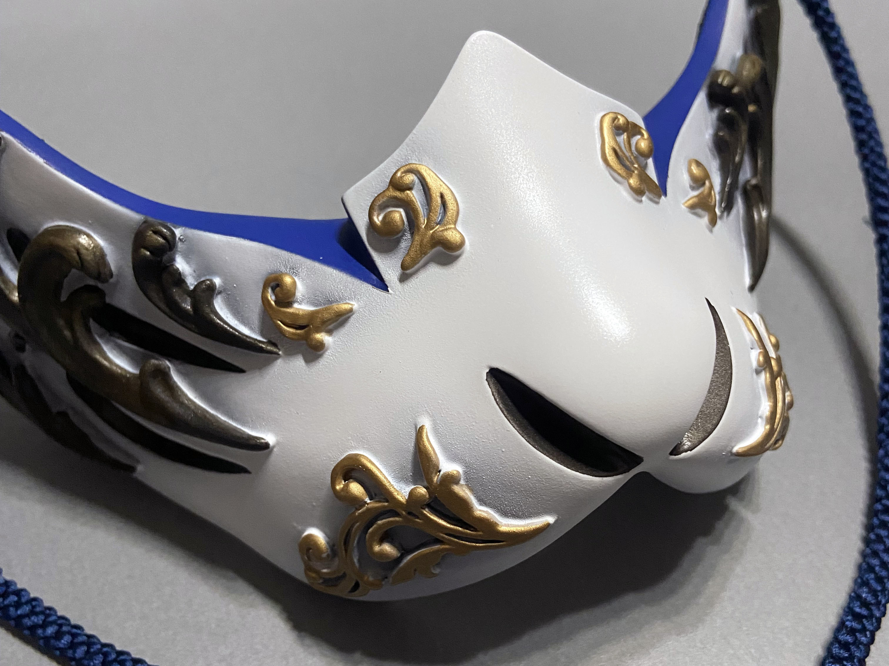 こちらの狐面には、ゴシック建築やギリシャ彫刻における代表的なモチーフである『アカンサス』の葉を、面全体にレリーフで装飾しております。