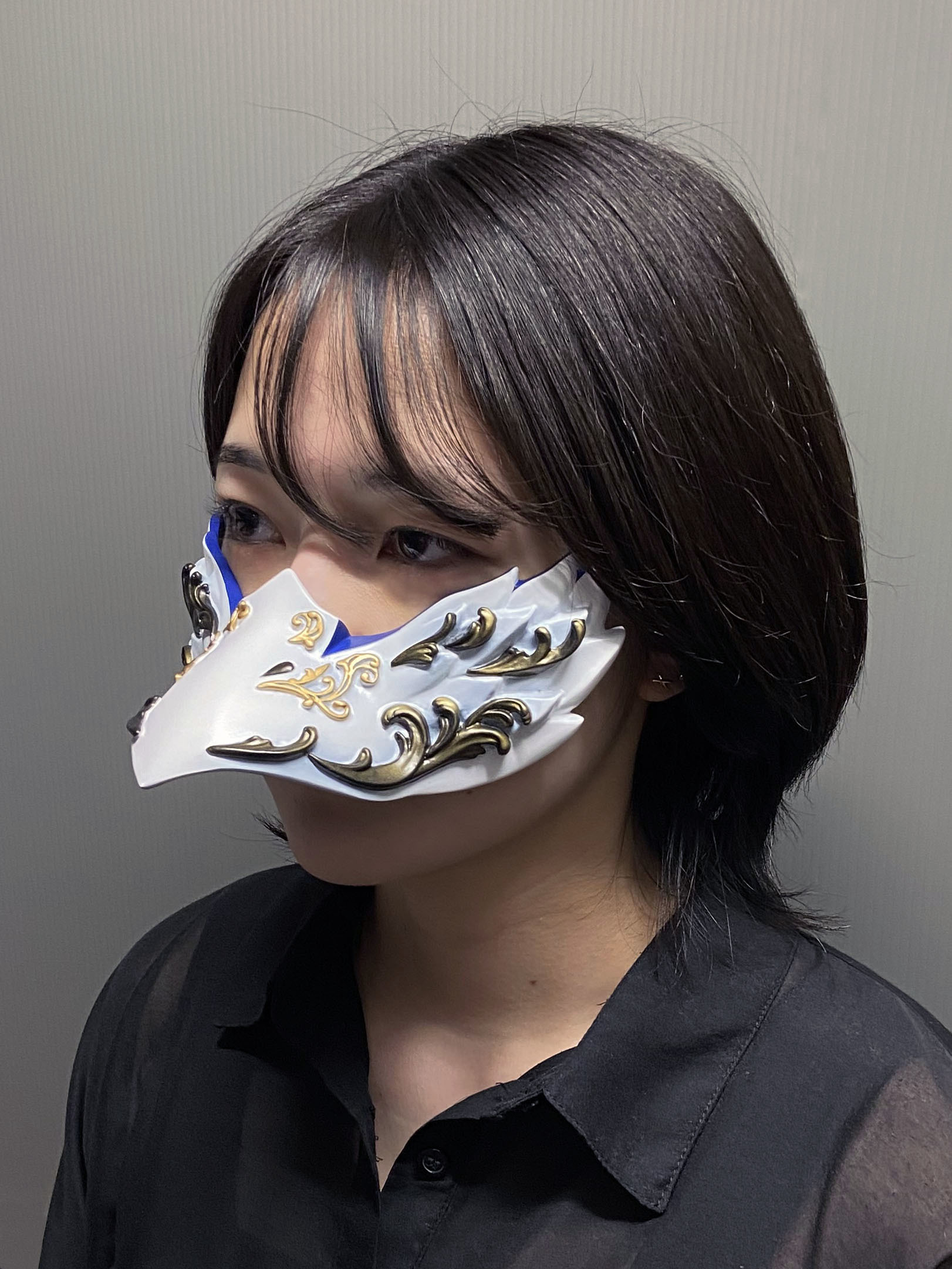 朧のマスクは現在すべての作品が、マスクに紐を接着(一体型)した状態となっております。