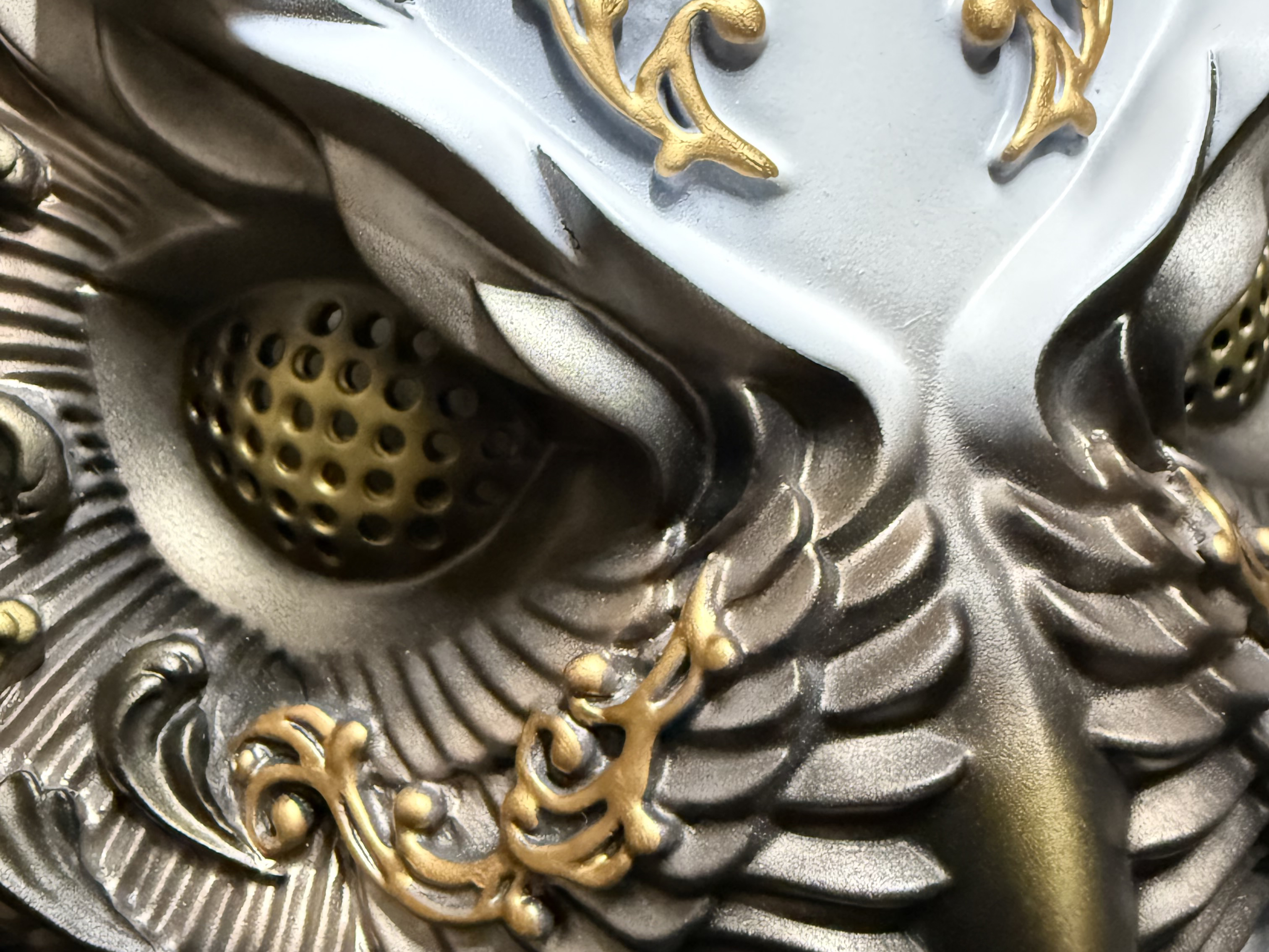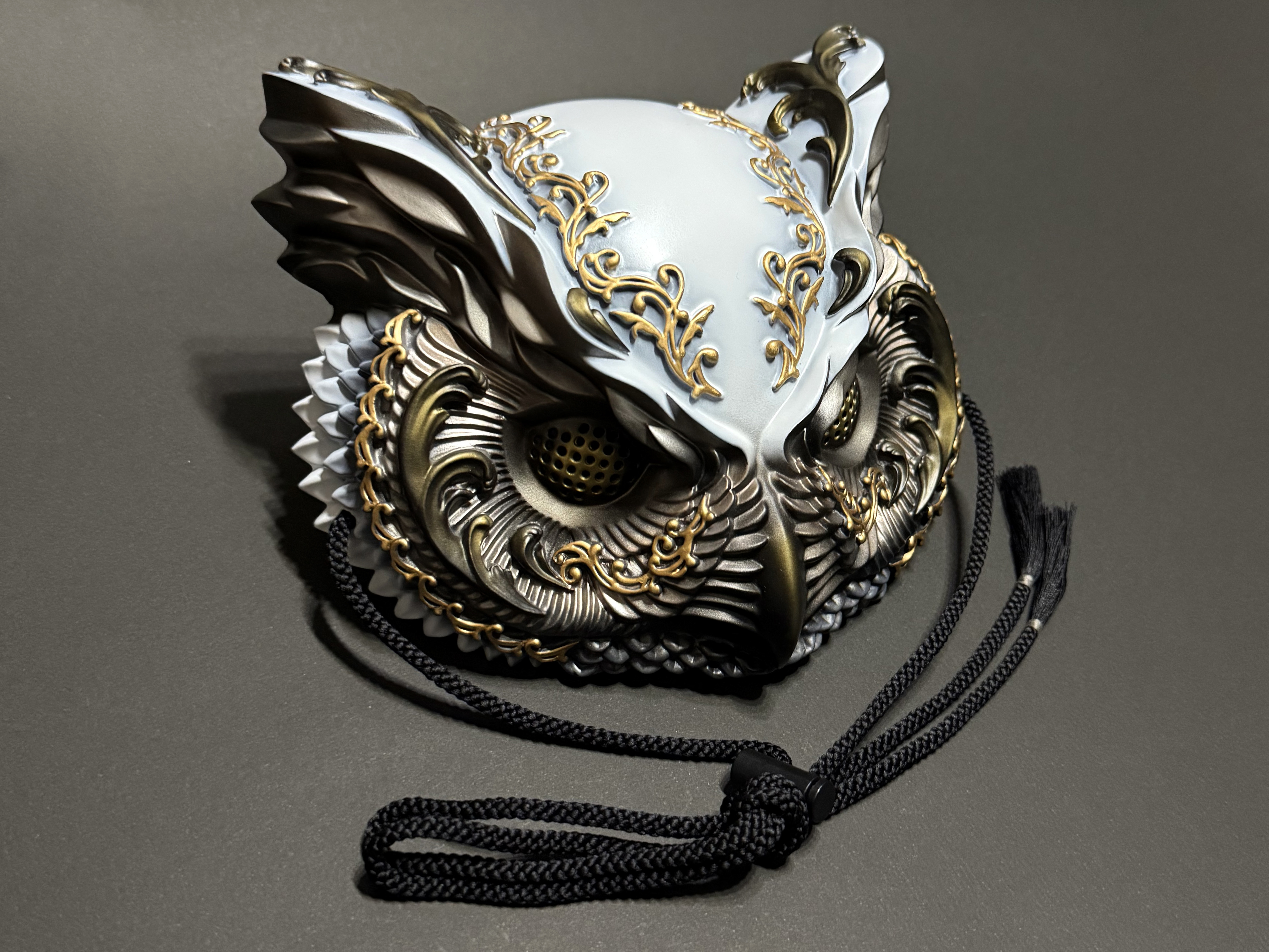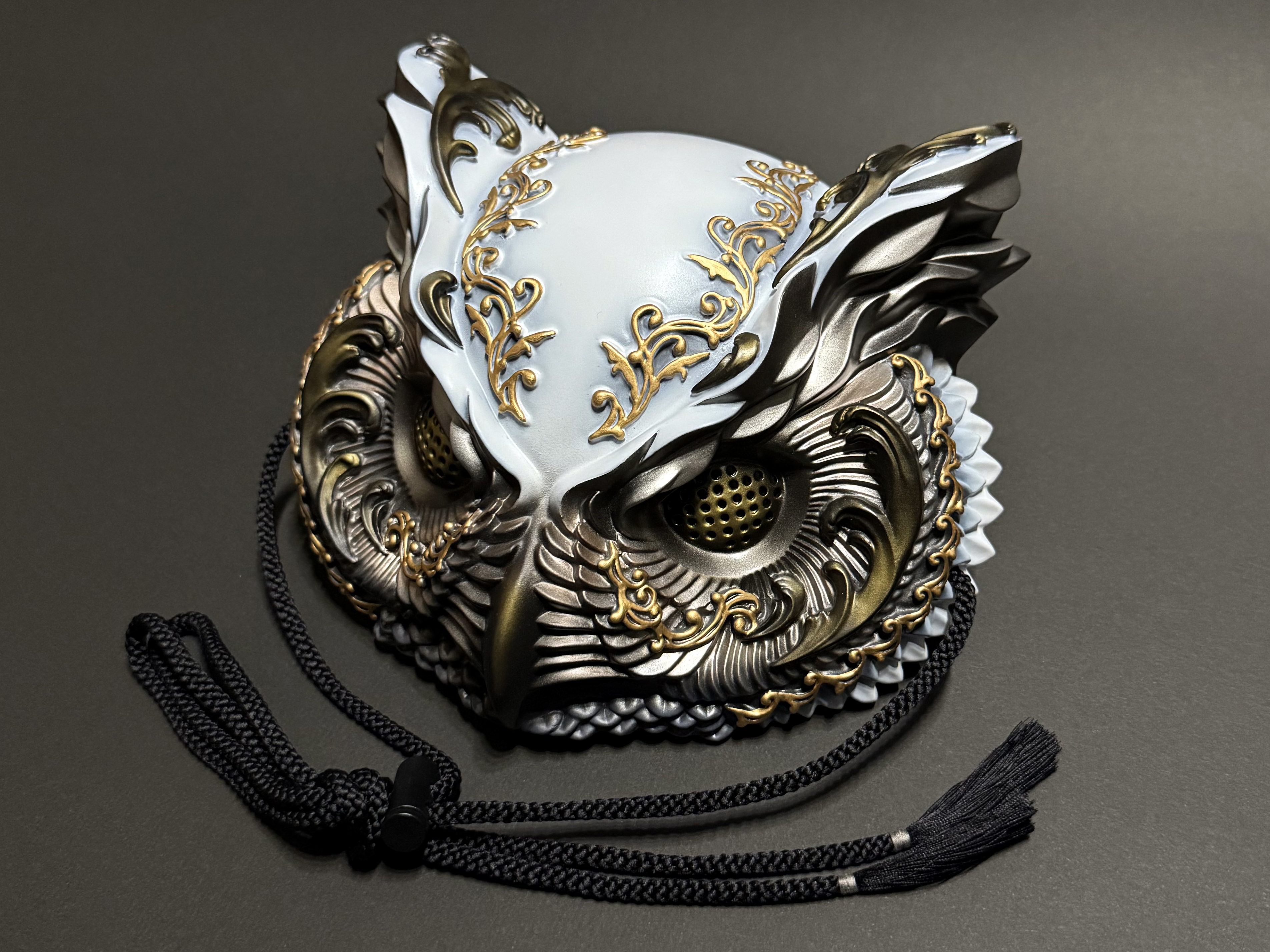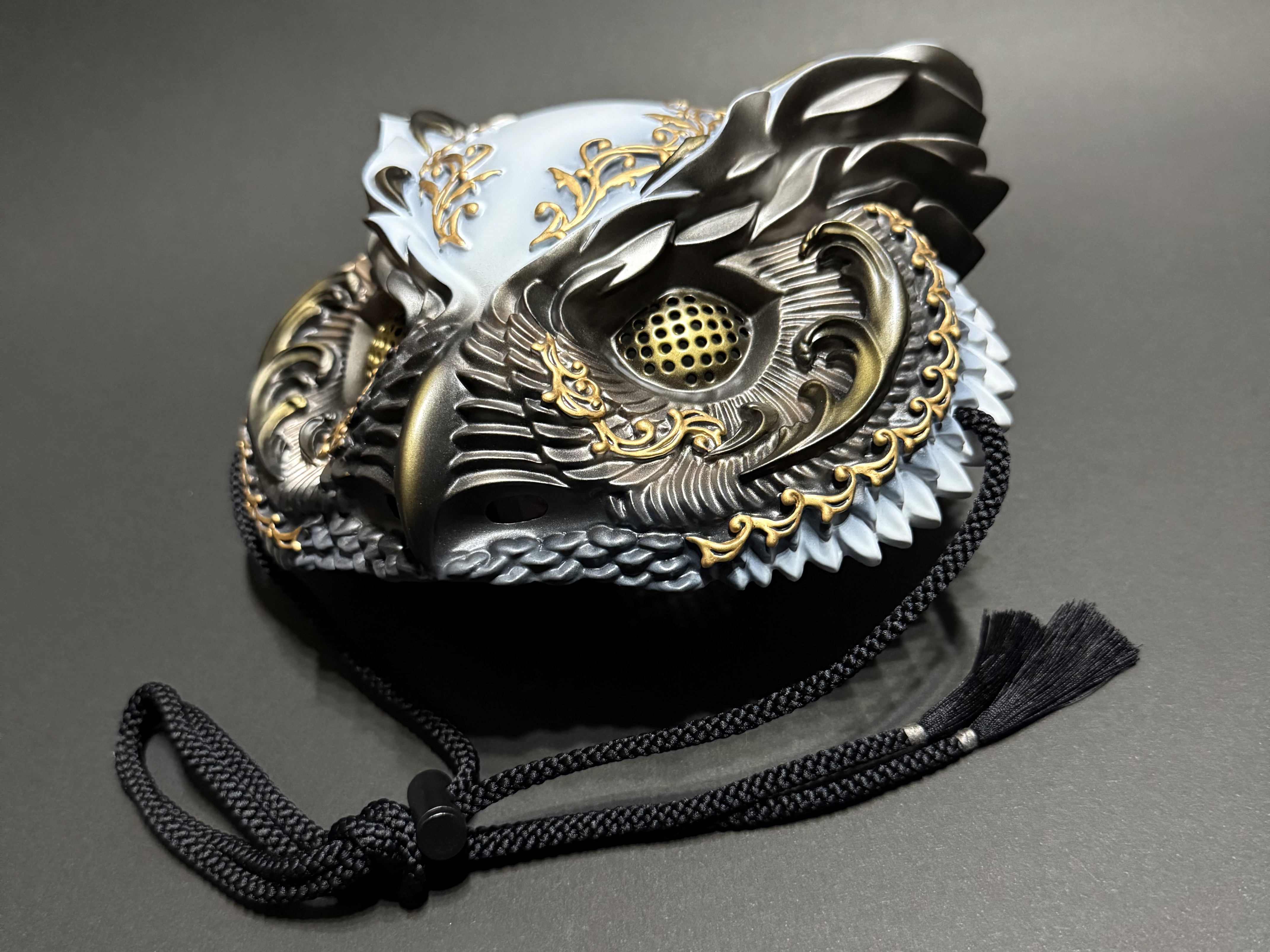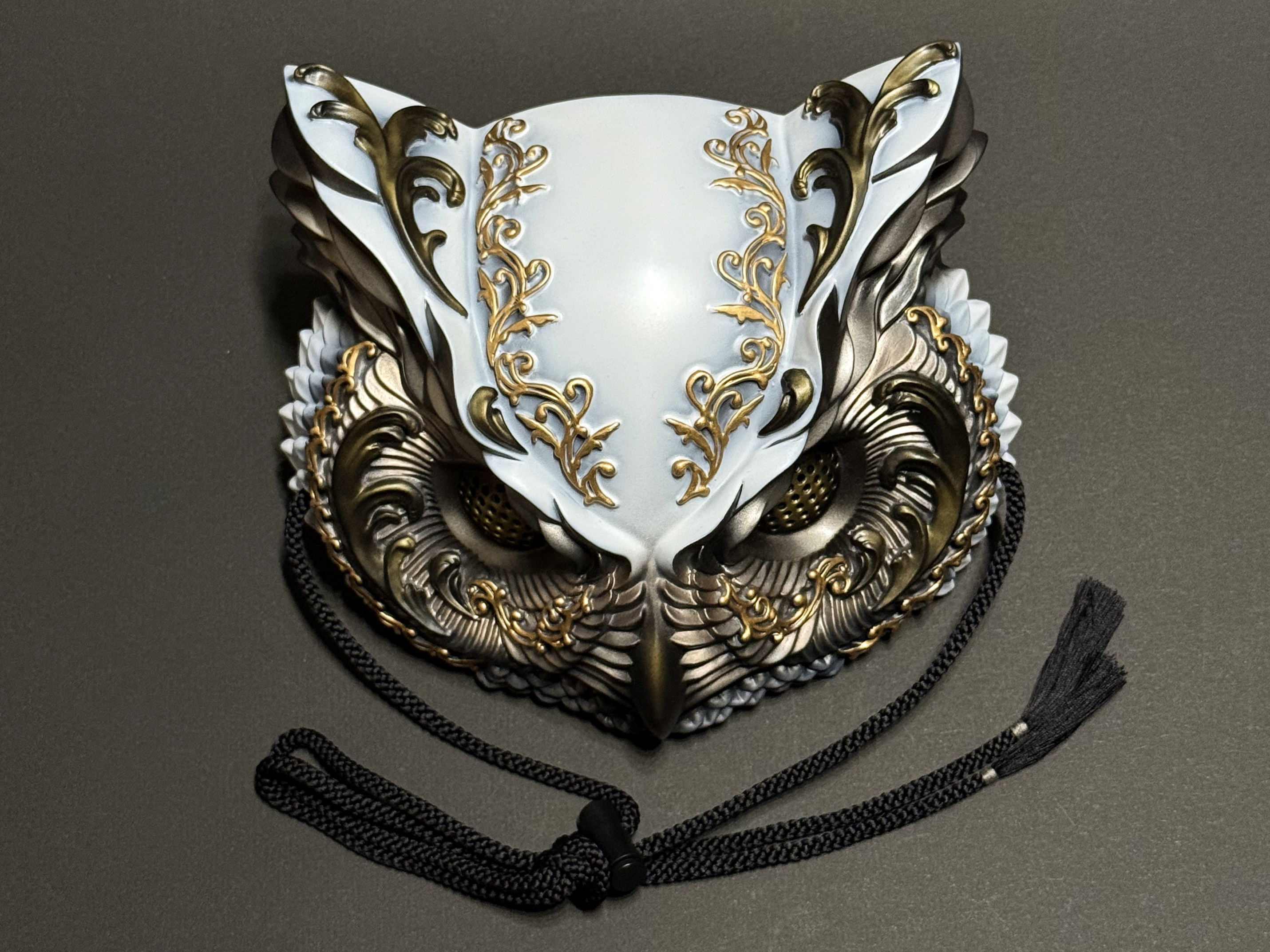 こちらの狐面には、ゴシック建築やギリシャ彫刻における代表的なモチーフである『アカンサス』の葉を、面全体にレリーフで装飾しております。